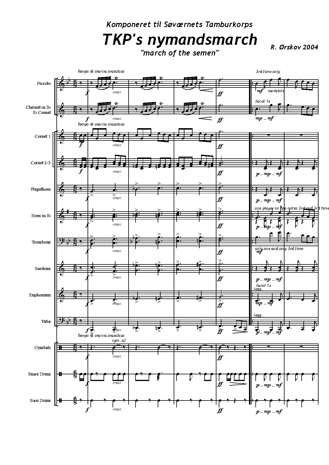 | Instrumentation | piccolo, B♭ clarinet, E♭ cornets, cornets 1, 2, and 3, flugelhorn, horns in E♭ 1 and 2, trombones 1 and 2, baritones 1 and 2, euphonium, tuba, cymbals, snare drum, bass drum, |