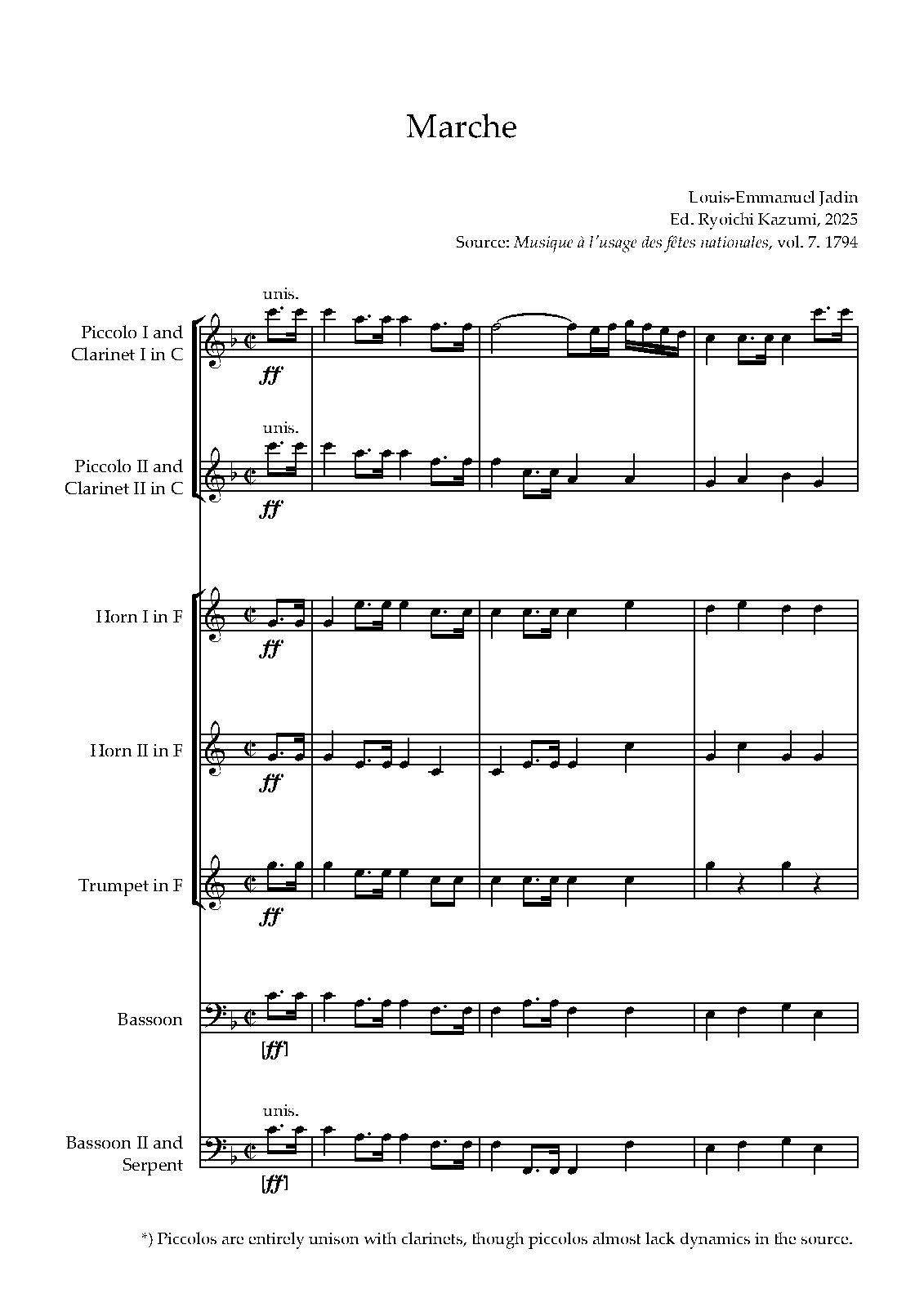 | InstrDetail | 2 piccolos, 2 clarinets, 2 bassoons, 2 horns, trumpet, serpent |