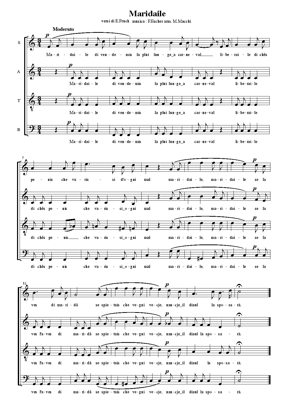 Apart from collecting folk songs, Escher also composed villotte, specifically for choirs, along the lines of popular Friulian songs, so this is likely male chorus rather than solo voices. Mr. Macchi's arrangement says "arm. M. Macchi". It is unclear what the nature of the harmonization is that would be different from Escher's original; perhaps the only difference is that it is for mixed chorus rather than male chorus.