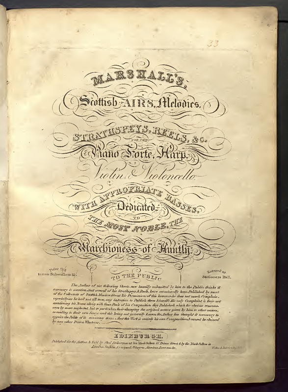 | Alternative. Title | Marshall's Scottish Airs, Melodies, Strathspeys, Reels, &c. for the Piano Forte, Harp, Violin, & Violoncello, with appropriate Basses |