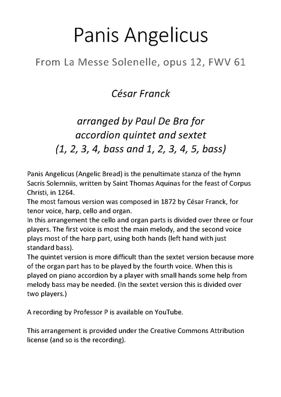 | Instrumentation | Voices: tenor, soprano (ad lib.), bass (ad lib.); mixed chorus (STB) Accompaniment, 1860: orchestra Accompaniment, 1865: harp, cello, double bass, organ (containing O salutaris) Accompaniment, 1872: harp, cello, double bass, organ (Panis angelicus replacing O salutaris) |