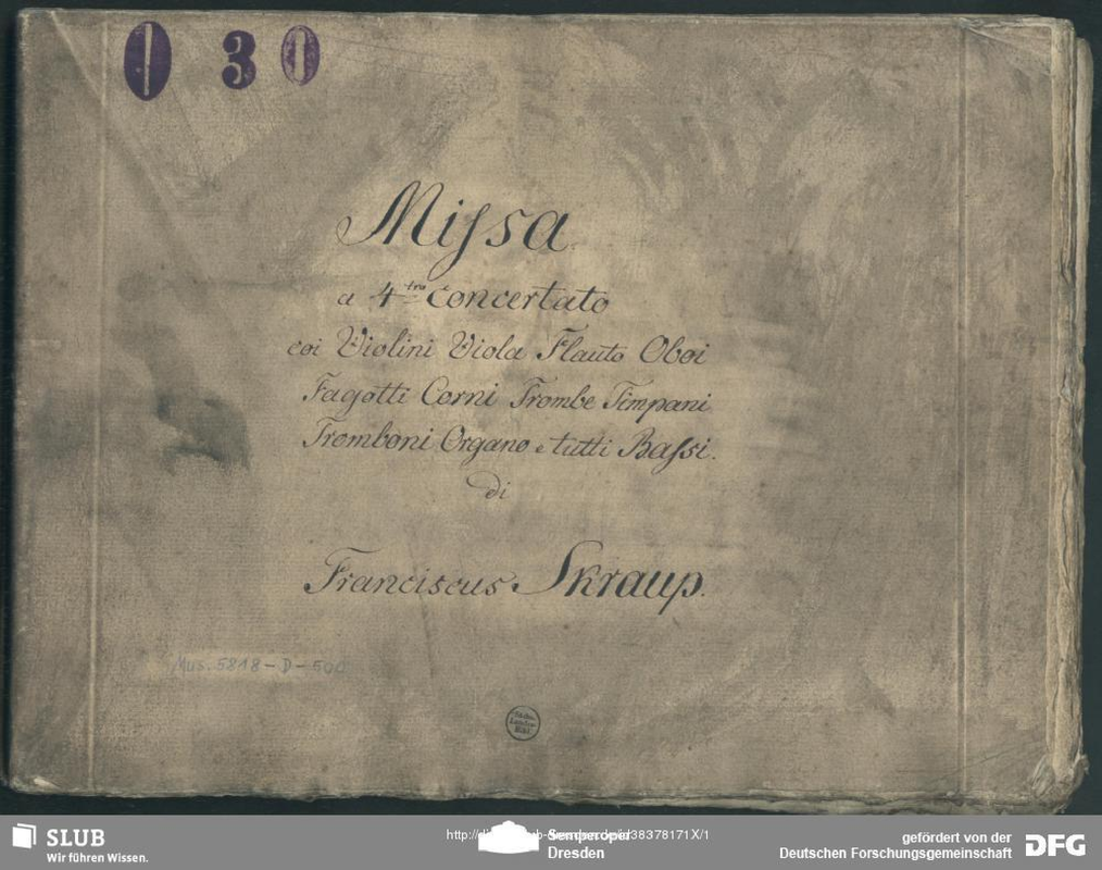 D-Dl Mus.5818-D-500 Copied by possibly unknown Dresden court copyists. Full name "Franciscus Skraup" on cover, so attribution difficulties below do not apply here.