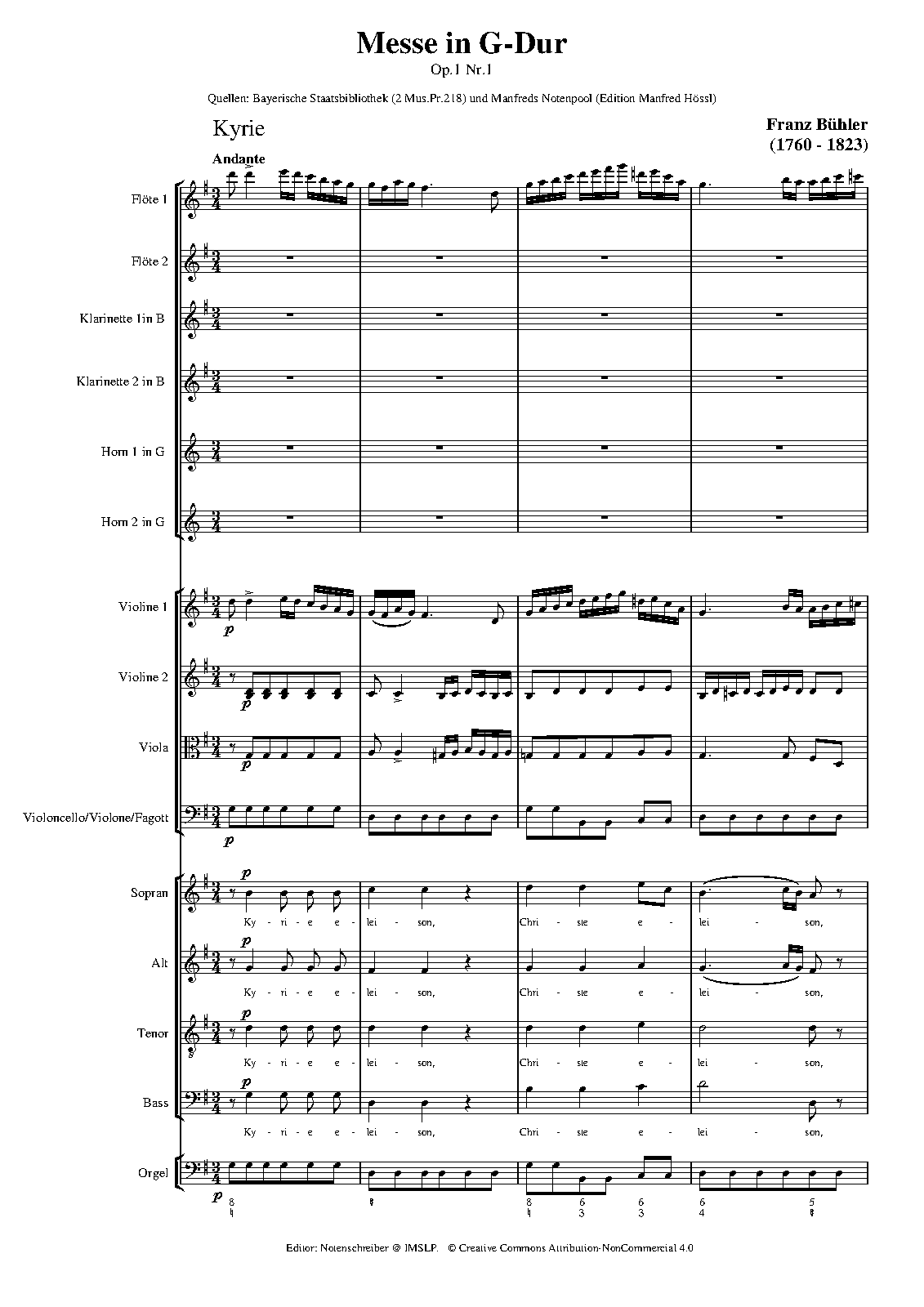 | Instrumentation | Voices: soprano, alto, tenor, bass; mixed chorus (SATB) Orchestra: 2 flutes, 2 clarinets (B), 2 horns (G), strings, continuo (organ) |