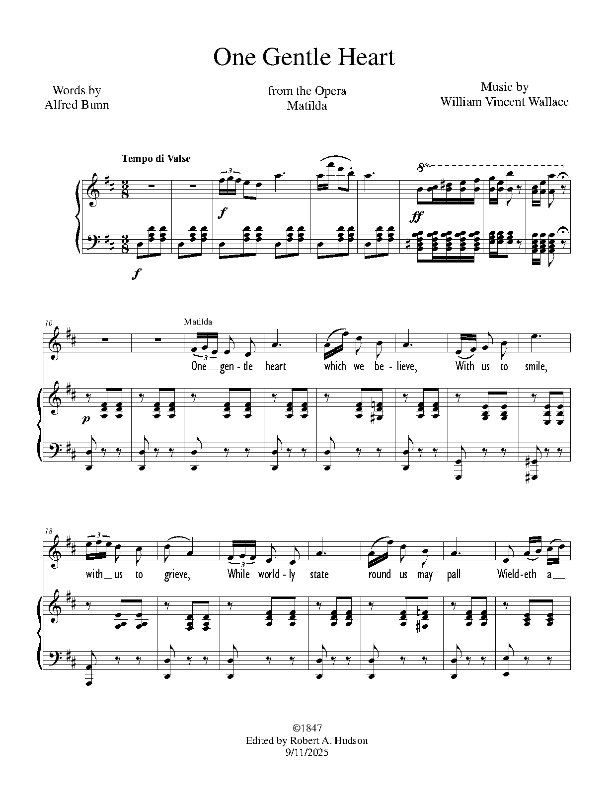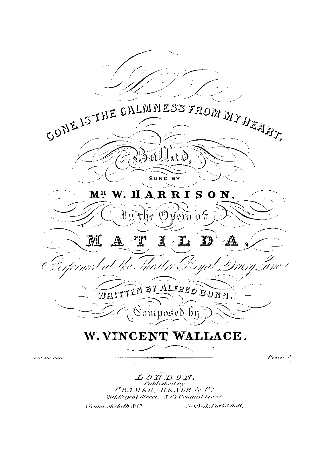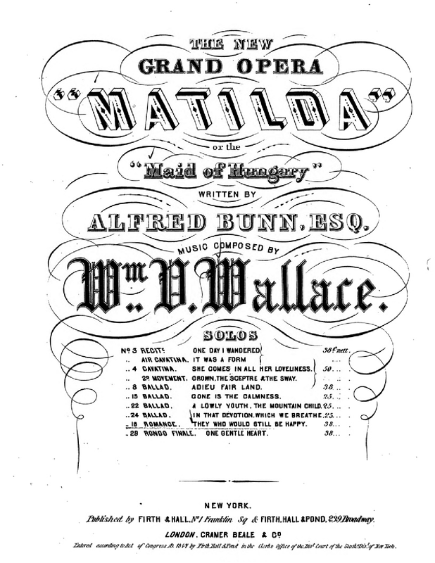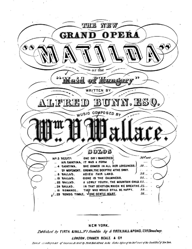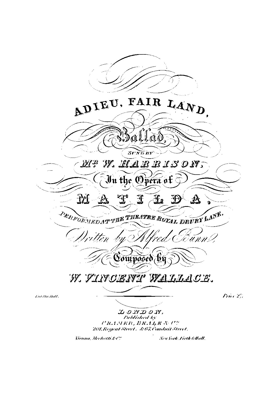 Premiere was 1847-2-15 according to the title page of the published libretto, 1847-2-22 according to Operone. Vocal score published by London: Cramer, Beale. Excerpts published in the same year by William Hall & Son of New York.