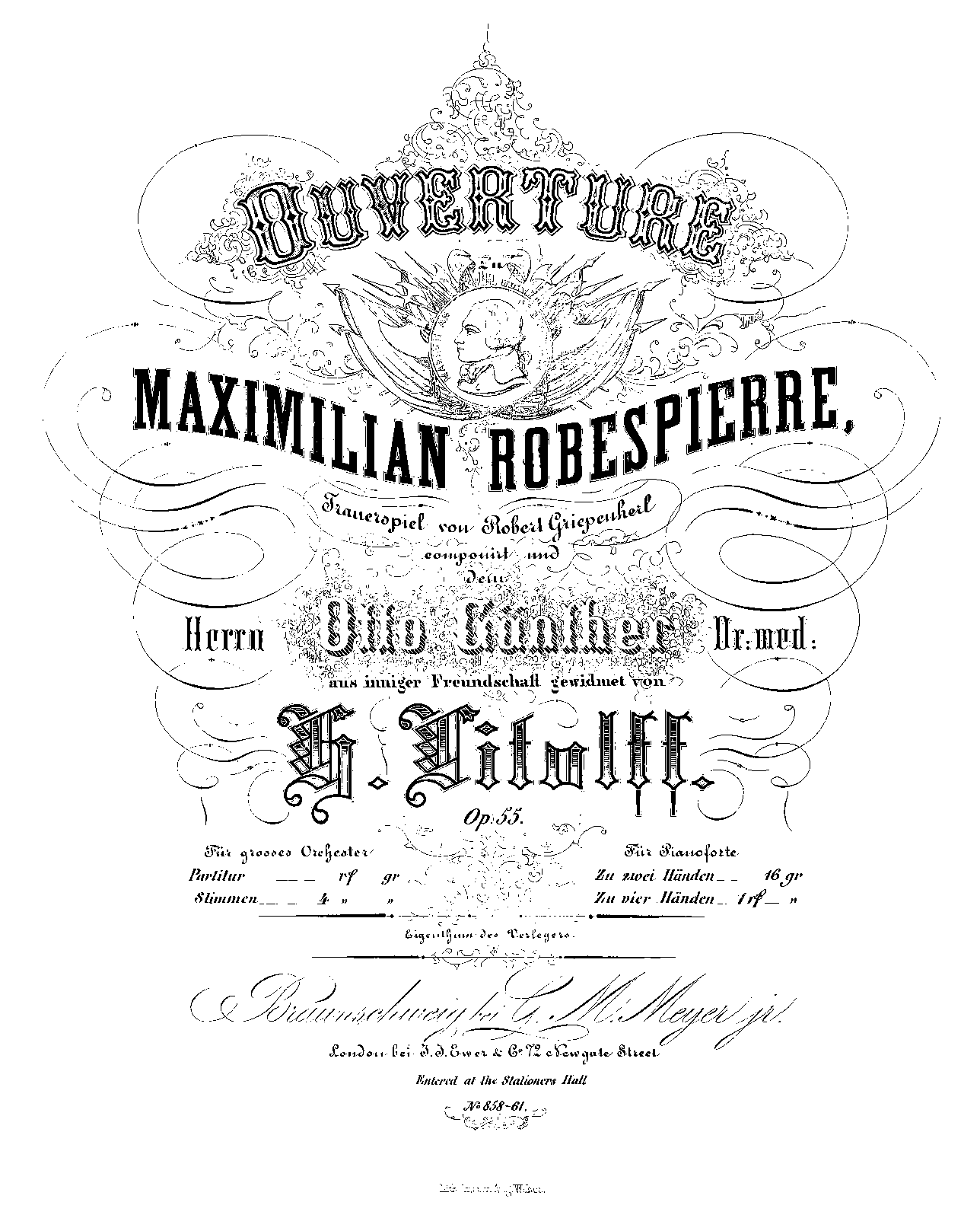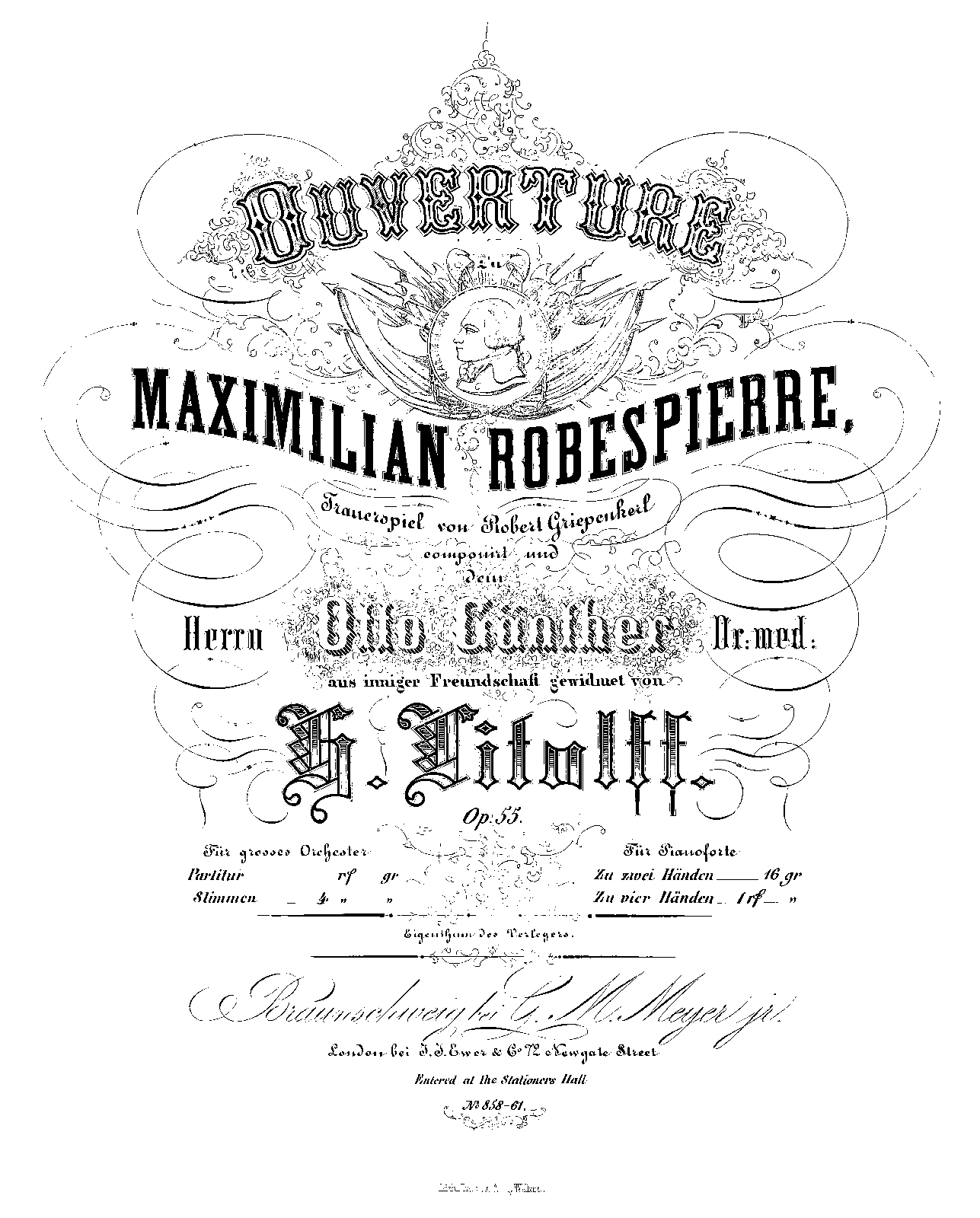 Publication as Maximilian Robespierre by Meyer in Braunschweig noted in Monatsbericht (1850), p.130 (inferred full score + parts, though the HMB does not specify either) and also in various piano reductions.
