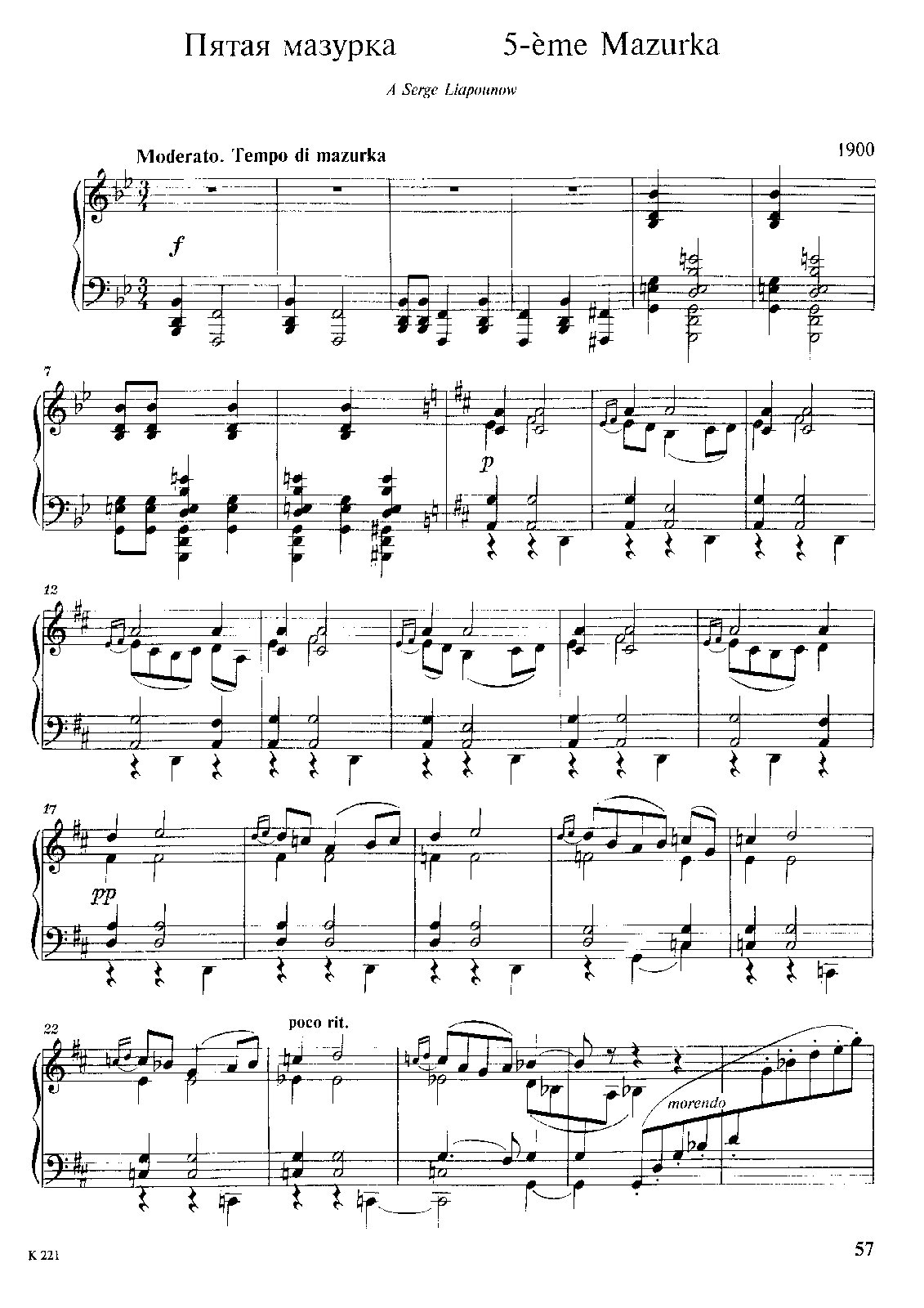 | Extra Information | *Monatsbericht (1900), p.602. There are at least 4 versions of this mazurka. It originates from Balakirev's earliest (1855) version of the piano sonata. It was rewritten for the so-called Sonata No.1 (1856). An unfinished version in C♯ major (1884) was completed and recorded by Nicholas Walker for Grand Piano (2016). The final version known as Mazurka No.5 (1900) was also used for the final version of the sonata (1905). |