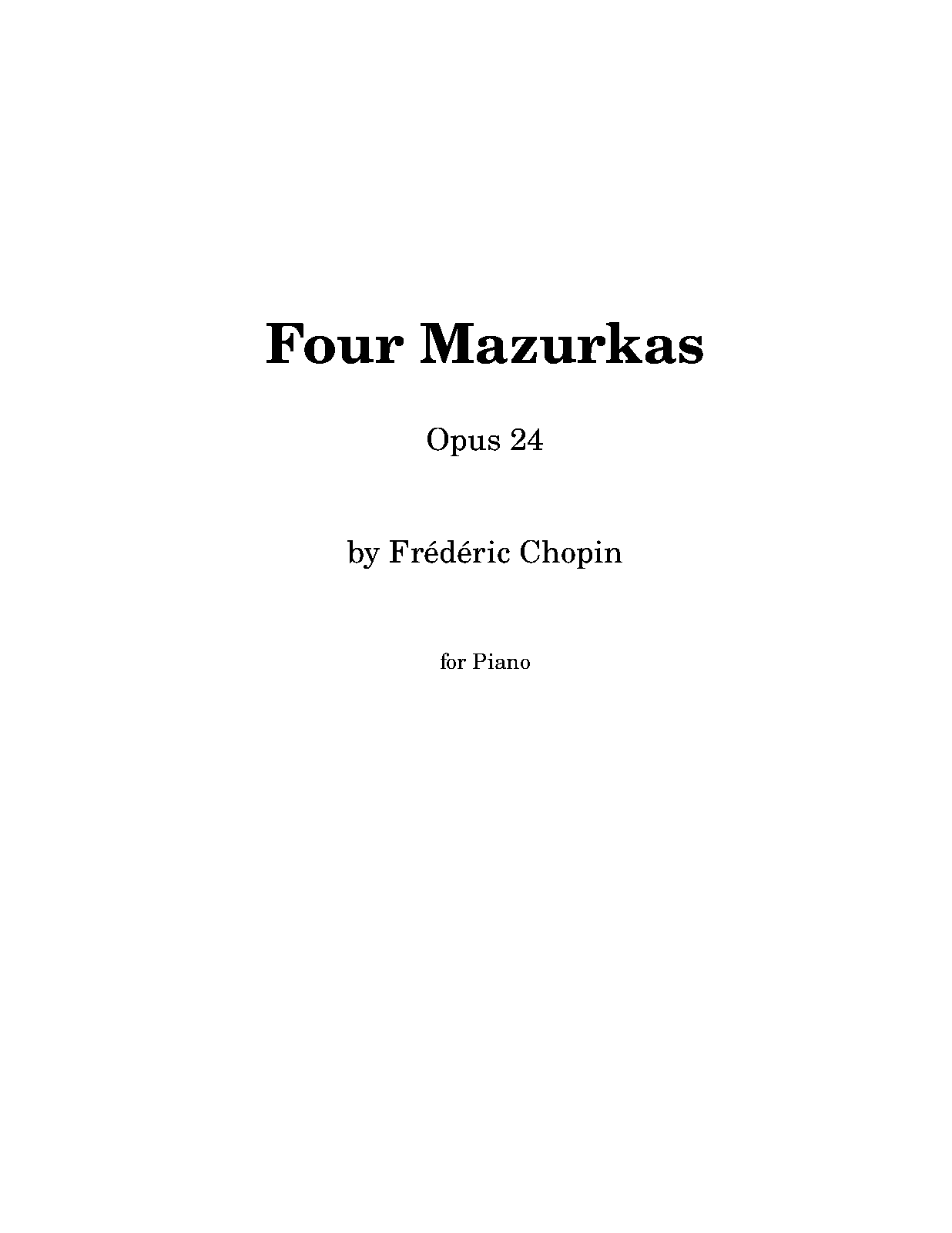 Name Aliases Mazurka's, opus 24 (Chopin); Four Mazurkas, Op. 24; Mazurkas, piano, op. 24; 4 Mazurkas, Op. 24; Μαζούρκες, Op. 24
