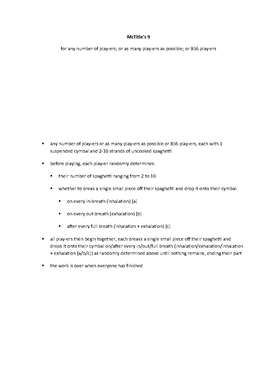 | Instrumentation | any number of play-ers or as many play-ers as possible or 856 play-ers, each with 1 suspended cymbal and 2-10 strands of uncooked spaghetti |