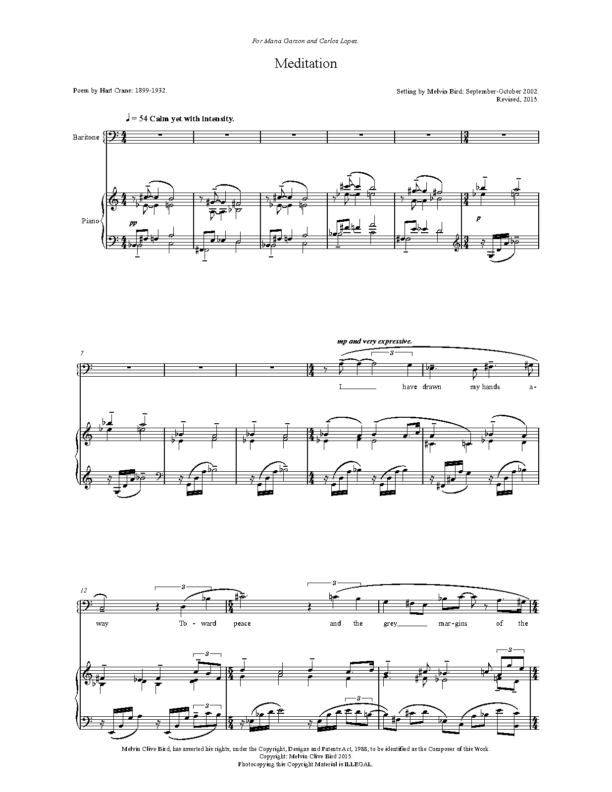 Melvin Bird has asserted his right under the Copyright, Designs and Patents Act, 1988, to be identified as the composer of this work. Please contact the composer for further information. The composer welcomes any performances and recordings. melvin.bird@hotmail.com. A clear and clean text.