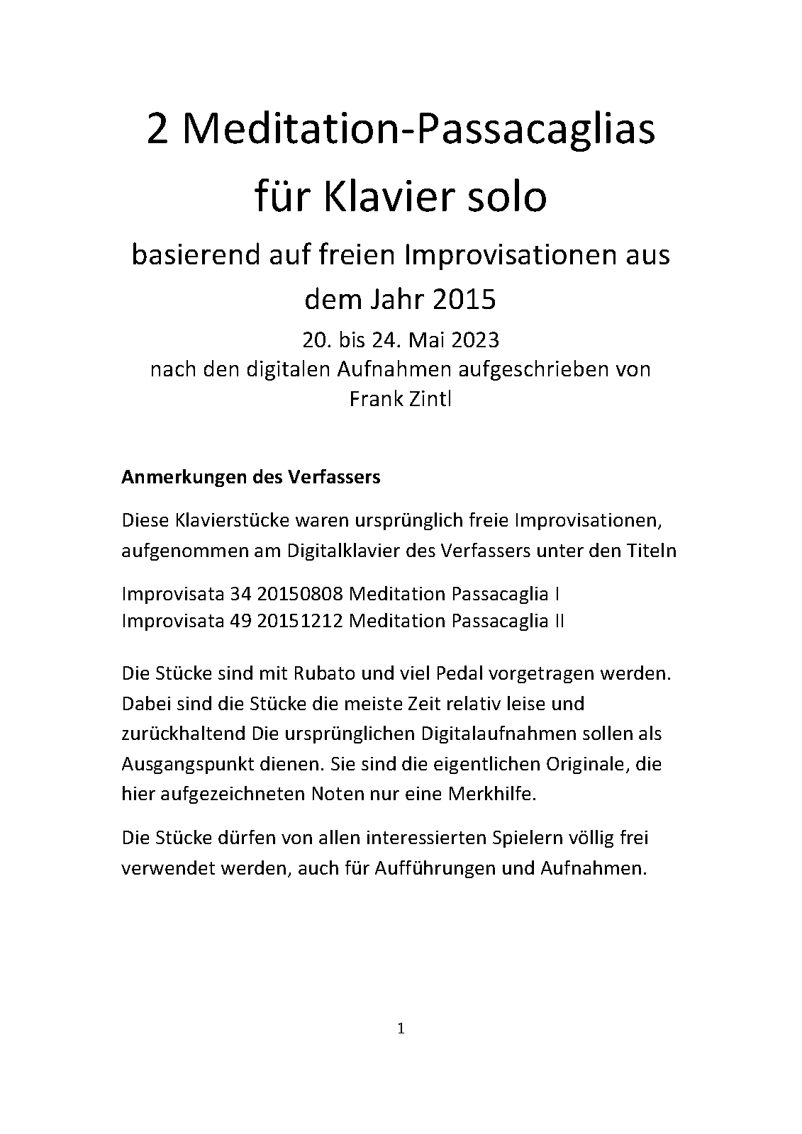 | Alternative. Title | Meditative Piano Pieces based on two own Improvisations recorded in 2015 |