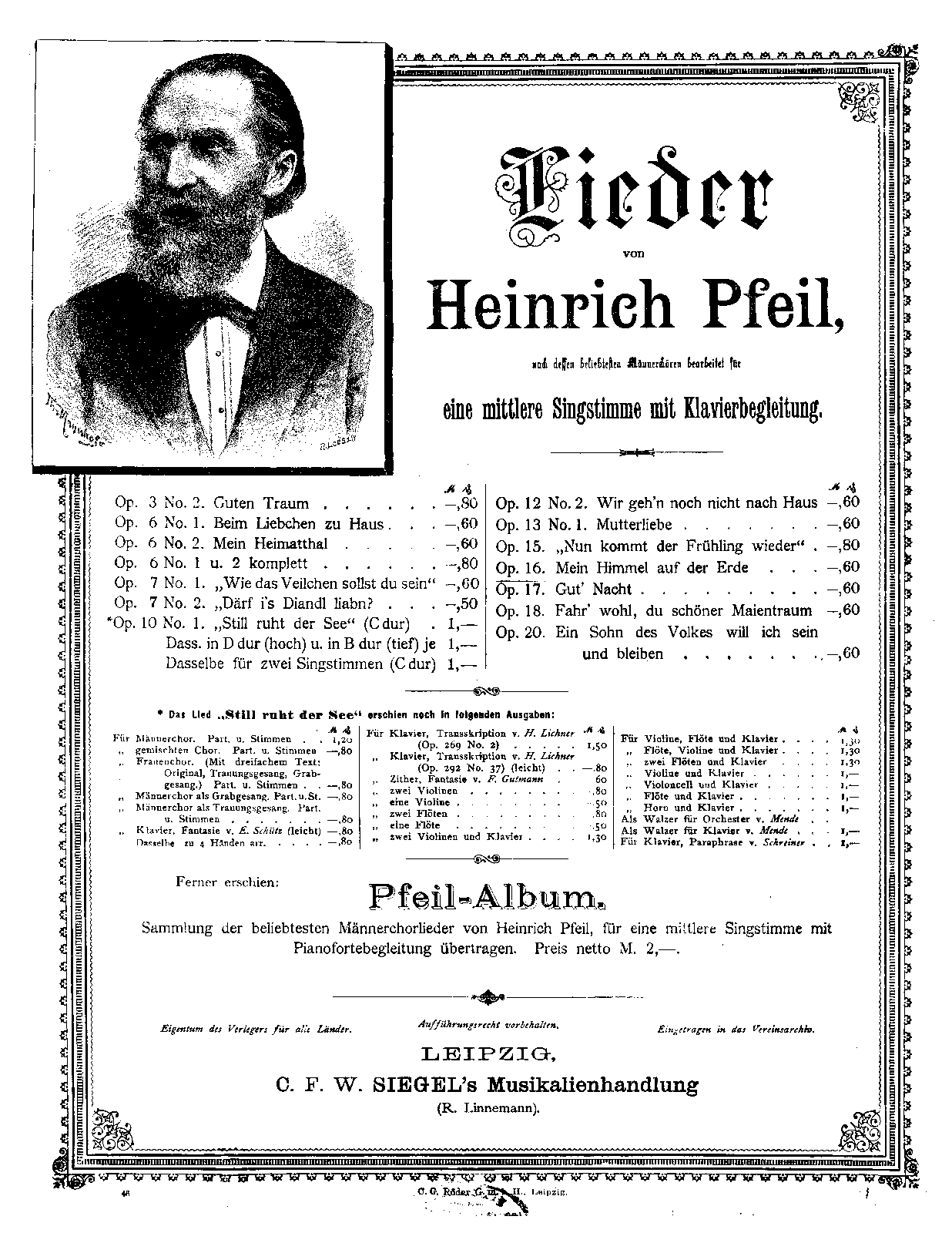 Original instrumentation is ascertained as male chorus, because of the statement on the title page saying "Sammlung der beliebtesten Männerchorlieder von Heinrich Pfeil, für eine mittlere Singstimme mit Pianofortebegleitung übertragen."