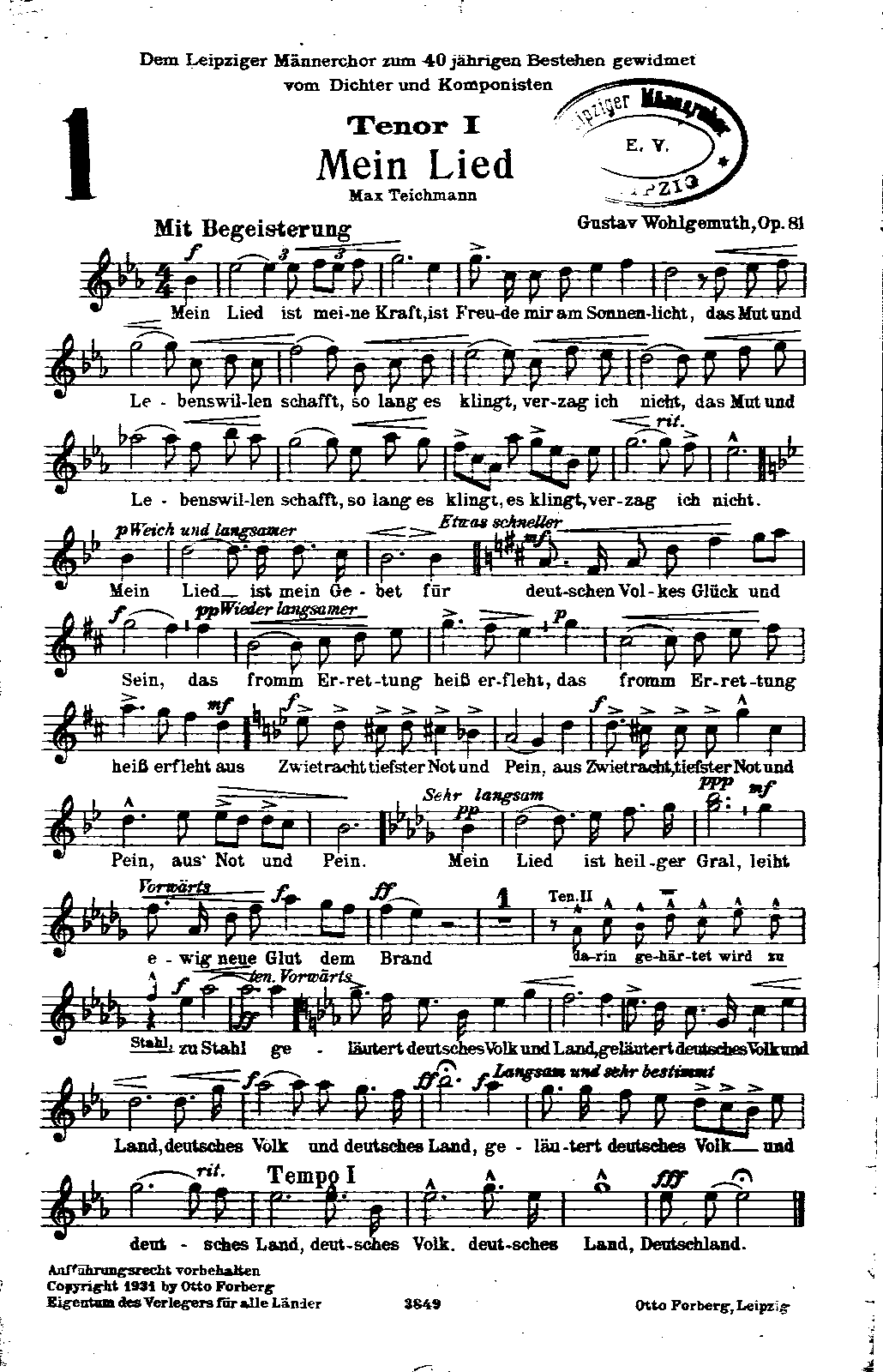 | Dedication | Dem Leipziger Männerchor zum 40 jährigen Bestehen gewidmet vom Dichter und Komponisten |