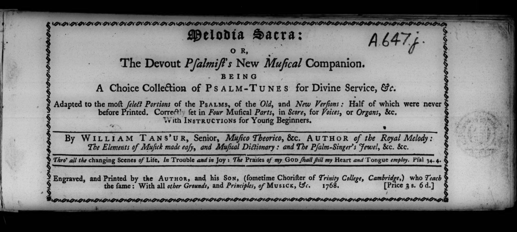 | Alternative. Title | Melodia Sacra: or, The Devout Psalmist's New Musical Companion. Being a choice collection of psalm-tunes for divine service, &c. adapted to the most select portions of the psalms, of the old, and new versions: half of which were never before printed. Correctly set in four musical parts, in score, for voices, or organs, &c. With instructions for young beginners |