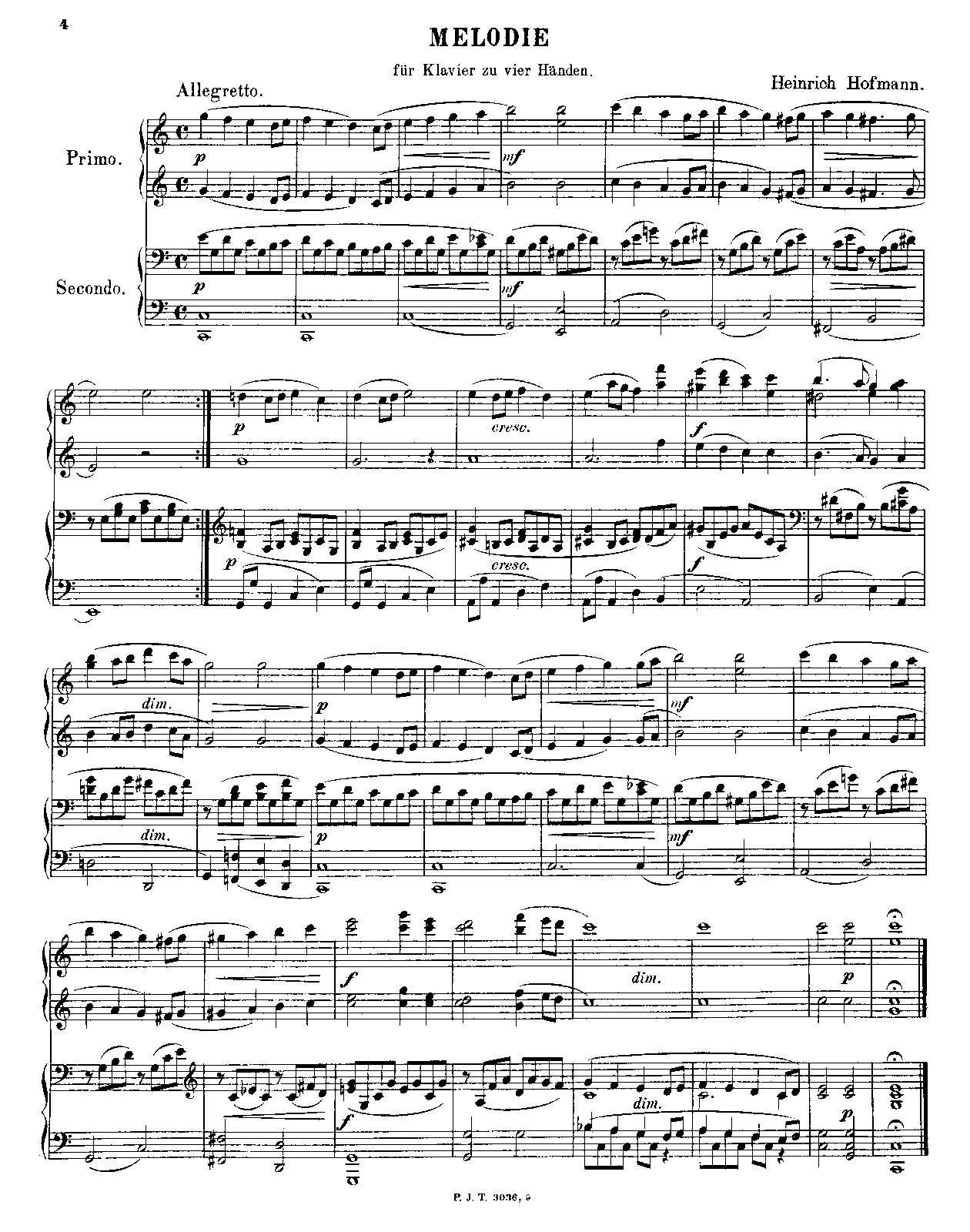 | Extra Information | It is very possible that this is the Melodie in C major being No.2 from the 4 Stücke for Piano 4 Hands, Op.76 published by Challier & Co. in 1885. However, I have no example of Op.76 No.2 to compare. |