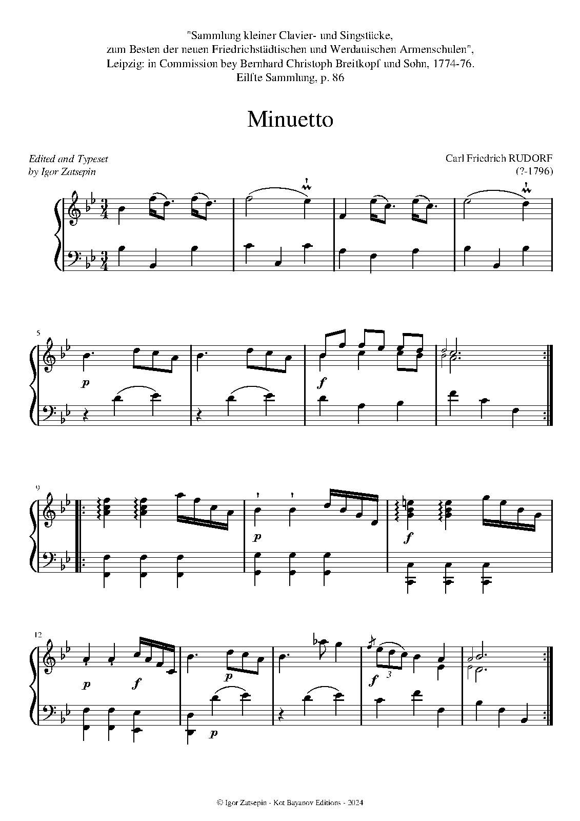 | Extra Information | "Sammlung kleiner Clavier- und Singstücke...", Breitkopf und Sohn, 1774-76 |
