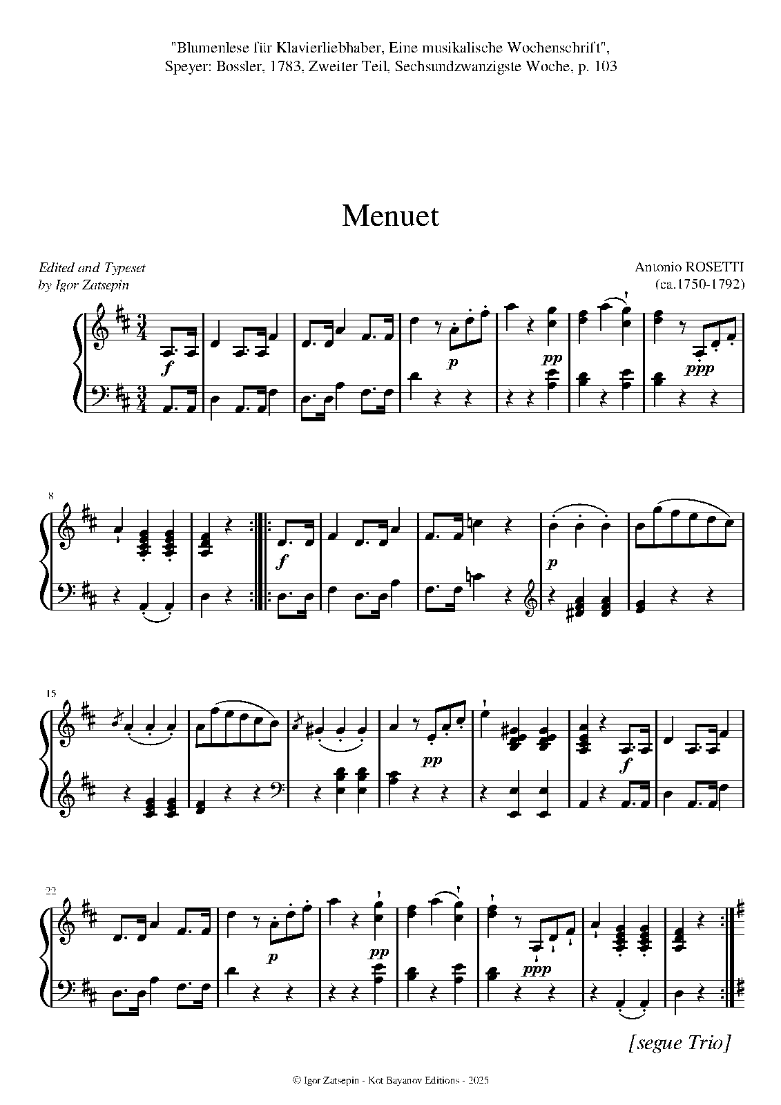 | Extra Information | "Blumenlese für Klavierliebhaber...", Speyer: Bossler, 1783 |