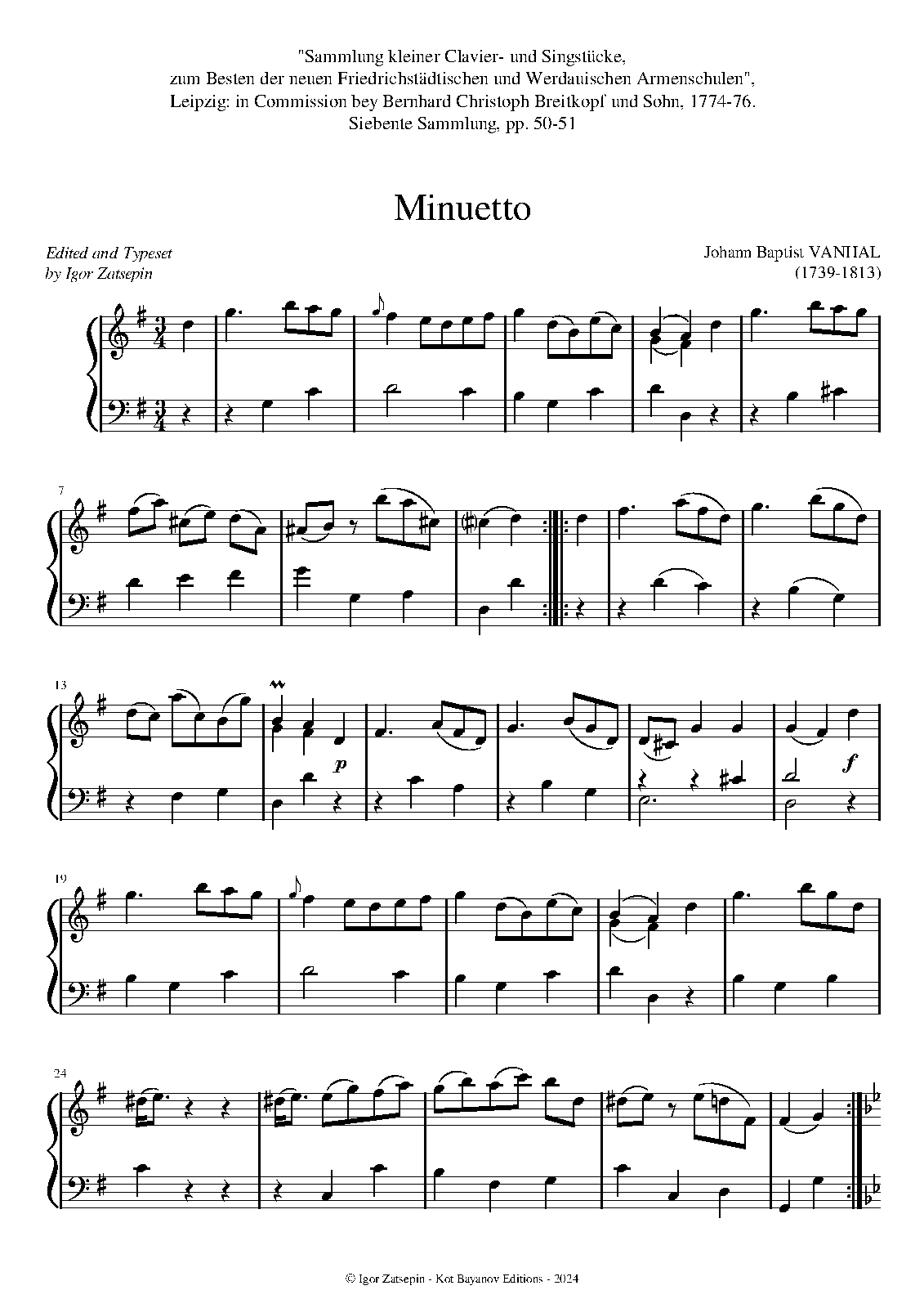 | Extra Information | "Sammlung kleiner Clavier- und Singstücke...", Breitkopf und Sohn, 1774-76 |