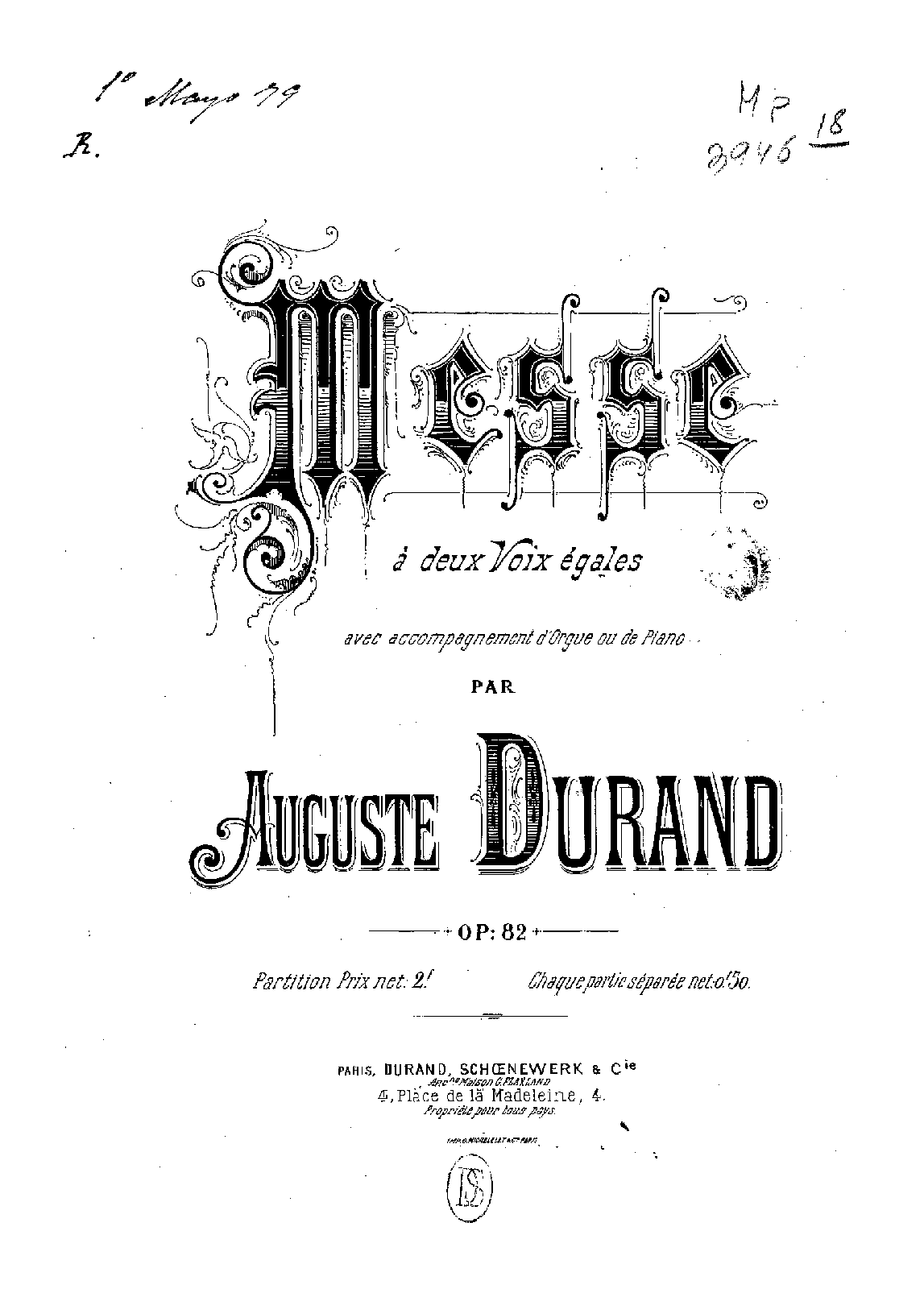 | Genre Categories | Masses; Religious works; For 2 equal voices, organ; |