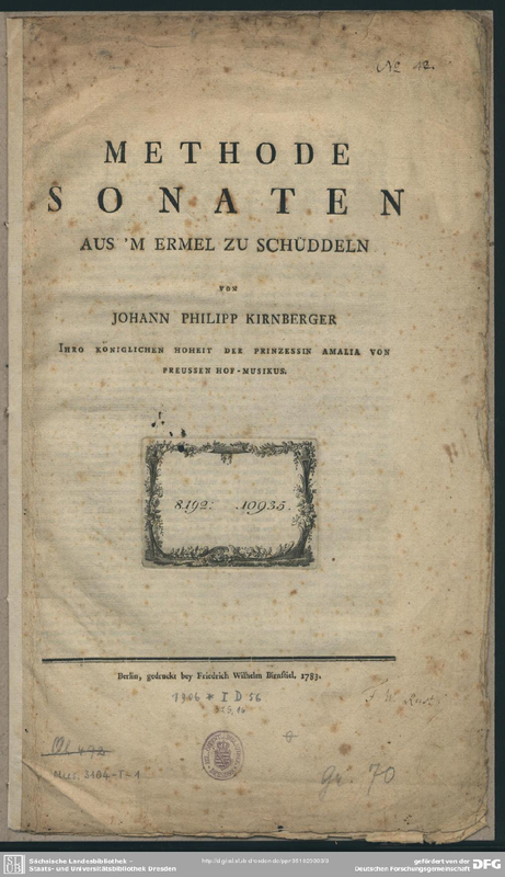 A miniature tract describing a simple method of composing: simply take an existing composition, write a new melody to its bass, then write a new bass part to the new melody (or vice-versa). As an example, Kirnberger prints a gigue by J.S. Bach, and his own composition following this method.