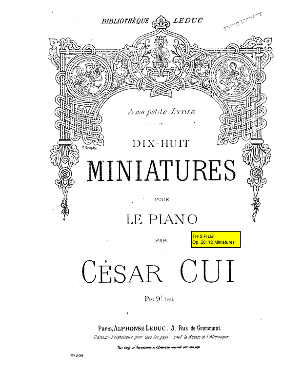 Also arranged for violin and piano by the composer. Nos. 5 and 8 were also arranged for violin and orchestra. Nos. 10, 4, 5, 6, 8, and 12 were orchestrated and published separately by Cui under the title Suite miniature.