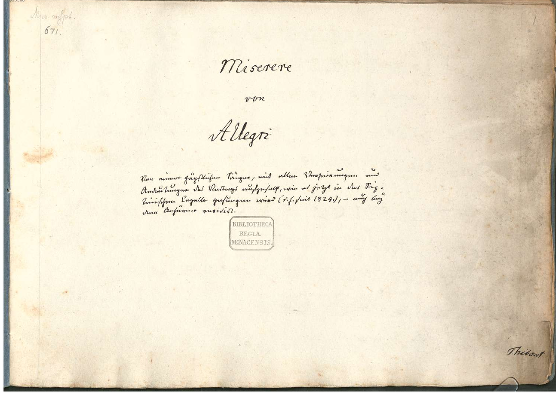 Title-page note: Von einem päpstlichen Sänger, mit allen Verzierungen und Andeutungen des Vortrags aufgesetzt, wie es jetzt in der Sixtinischen Capelle gesungen wird (v. j. seit 1824), - auch bey dem Anhören revidirt