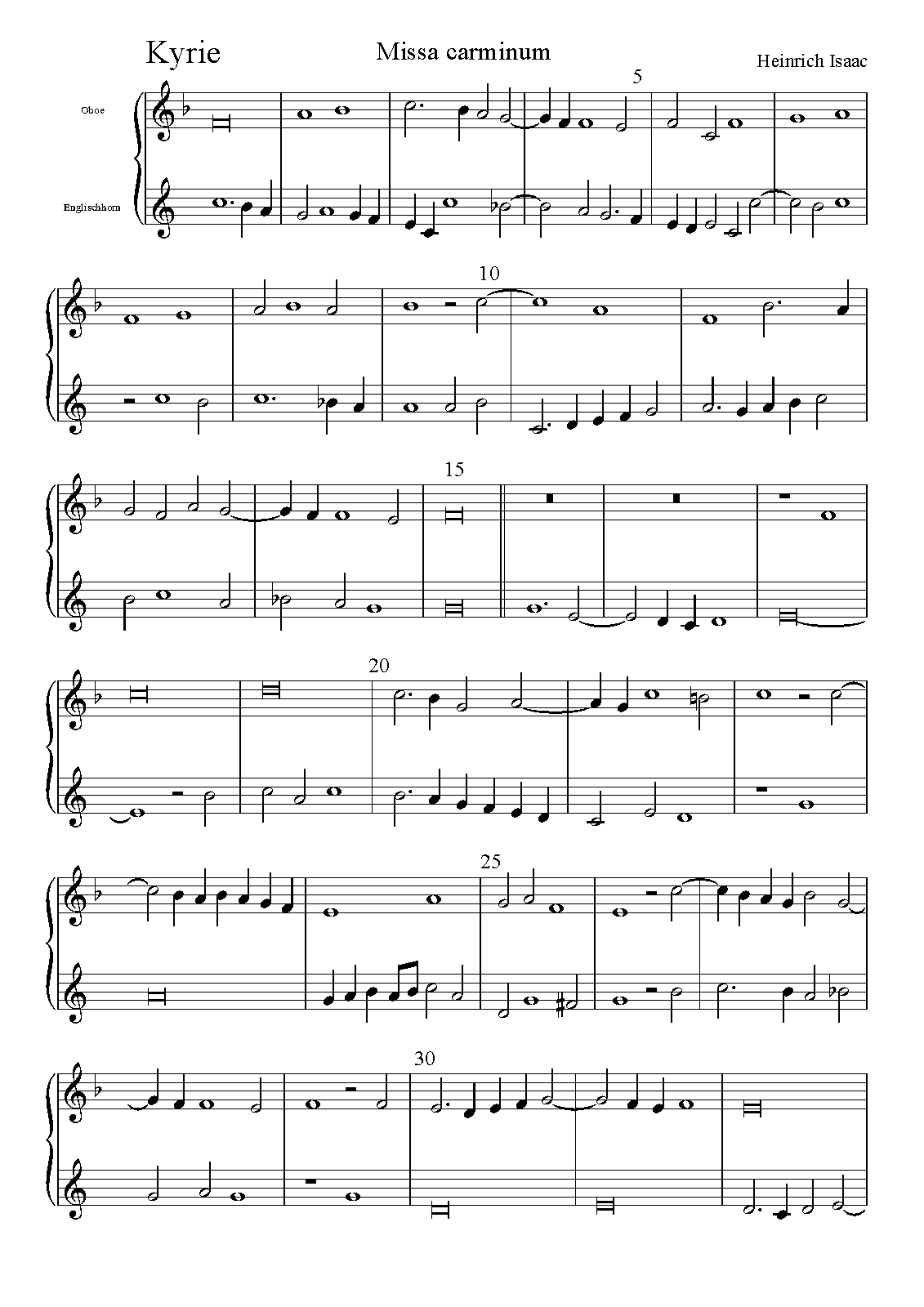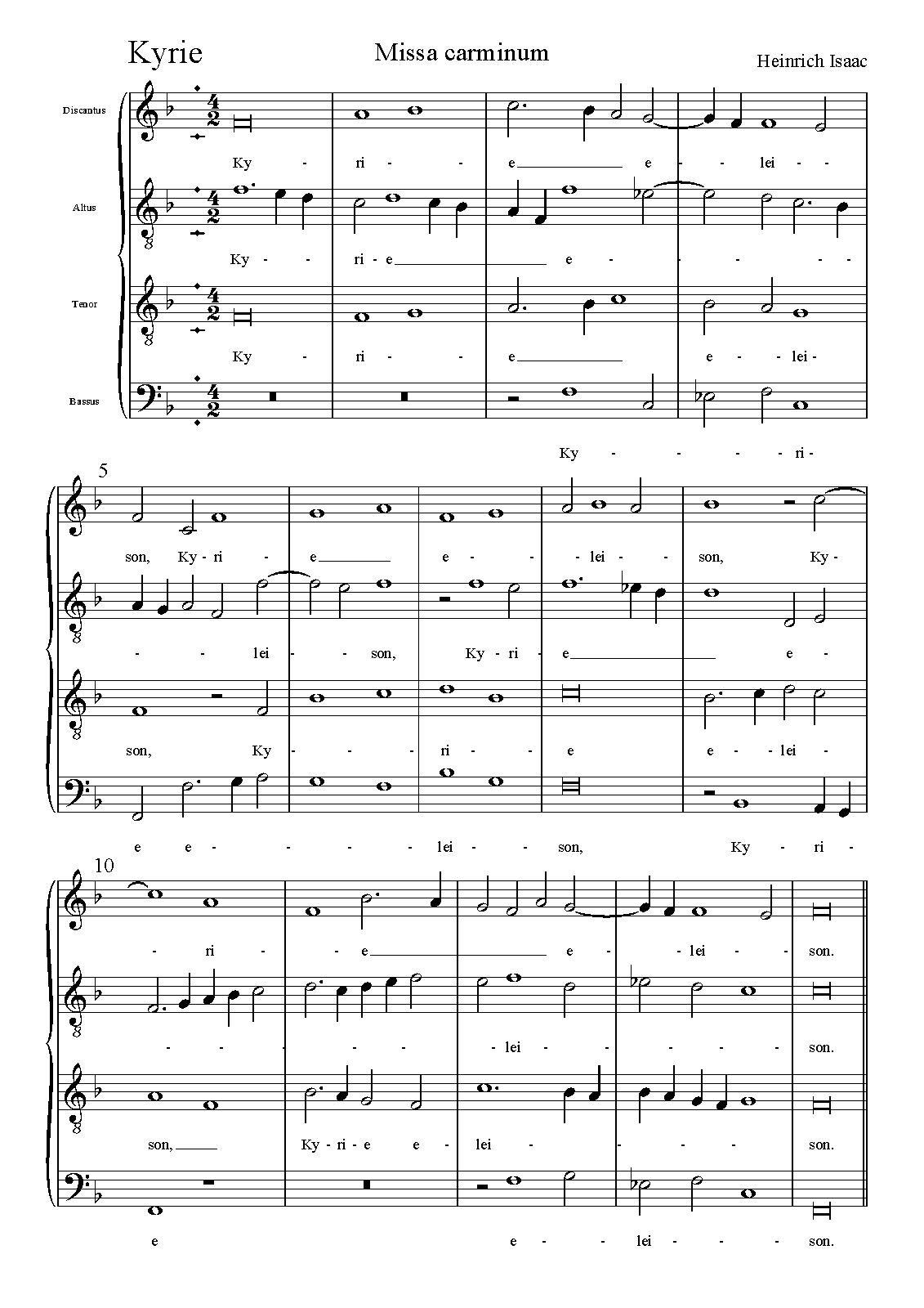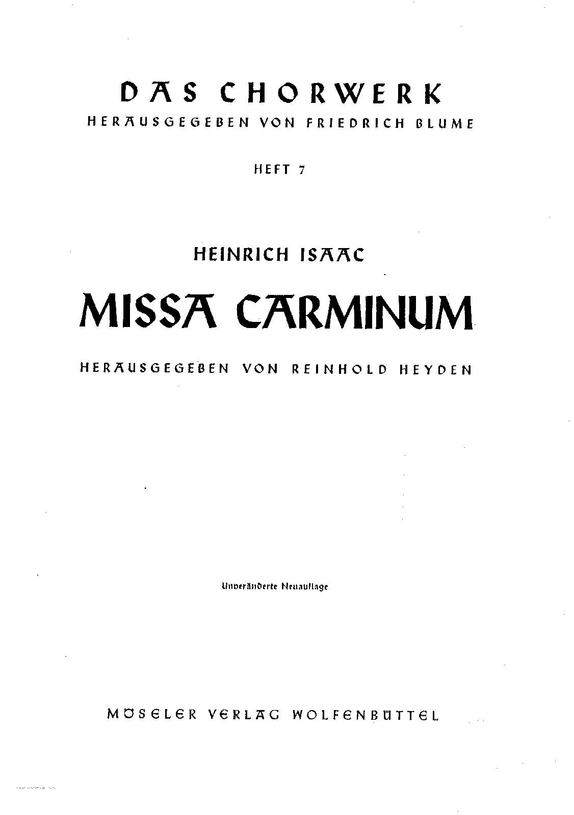 According to at least some (modern) sources, only partially by Isaac, but not entirely, even though Isaac's name was attached to it from its earliest surviving source. (Burn, David J., Heinrich Isaac and his Recently Discovered Missa Presulem ephebeatum, in ""Recevez Ce Mien Petit Labeur": Studies in Renaissance Music in Honour of Ignace Bossuyt" (Leuven University Press, 2008), Mark deLaere and Pieter Bergë, editors, pp.51–52 (noting an article, Heidrich, Jürgen, "Heinrich Isaacs (?) Missa Carminum (from Heidrich's site: Heinrich Isaacs(?) ‚Missa Carminum‘: Überlieferung – Werkgestalt – Gattungskontext, in: Jahrbuch der Ständigen Konferenz Mitteldeutsche Barockmusik 2001, Schneverdingen 2002, 123-139.)