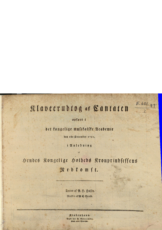 | Alternative. Title | Klaveerudtog af Cantaten opført i det kongelige musikalske Academie den 1ste December 1792, i Anledning af Hendes Kongelige Høiheds Kronprindsessens Nedkomst |