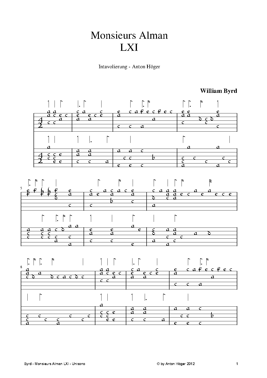 The extended variation on Monsieurs Alman is named "Munsers Almaine" in the Lady Nevells Booke, no. 38. Sometimes labelled as Monsieurs Aman II.