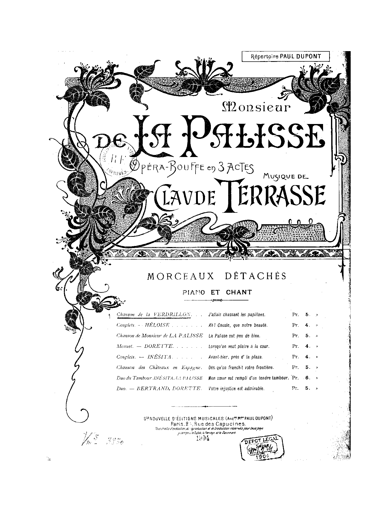 | Copyright Information | Publication noted in the Bibliographie de la France : 93e année, 2e série, Nº 50, 10 Décembre 1904, p.792, regs.6070-71 (vocal score). |