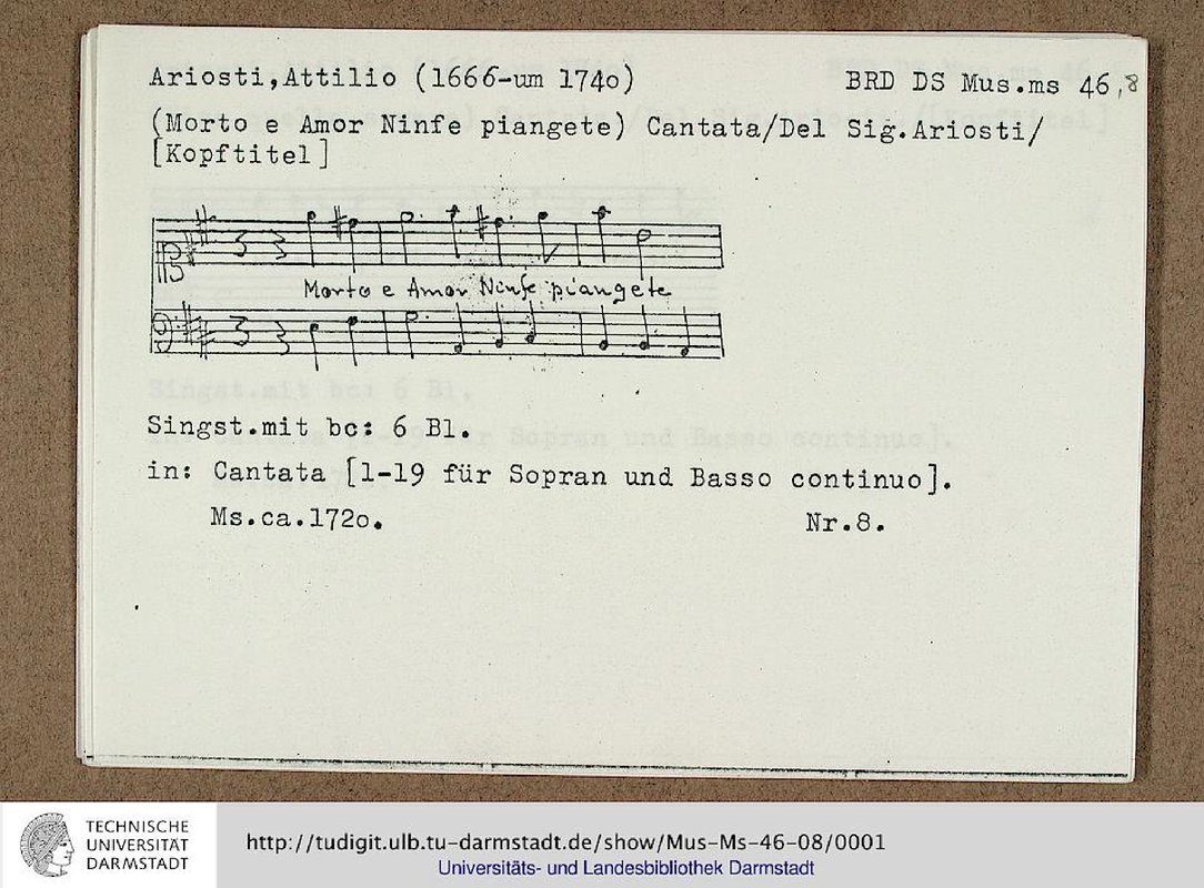 D-Ds Mus.Ms. 46 (part of a collection of 19 cantatas and one aria attributed to Ariosti by the copyists. RISM does not provide a guess at the librettist here.)