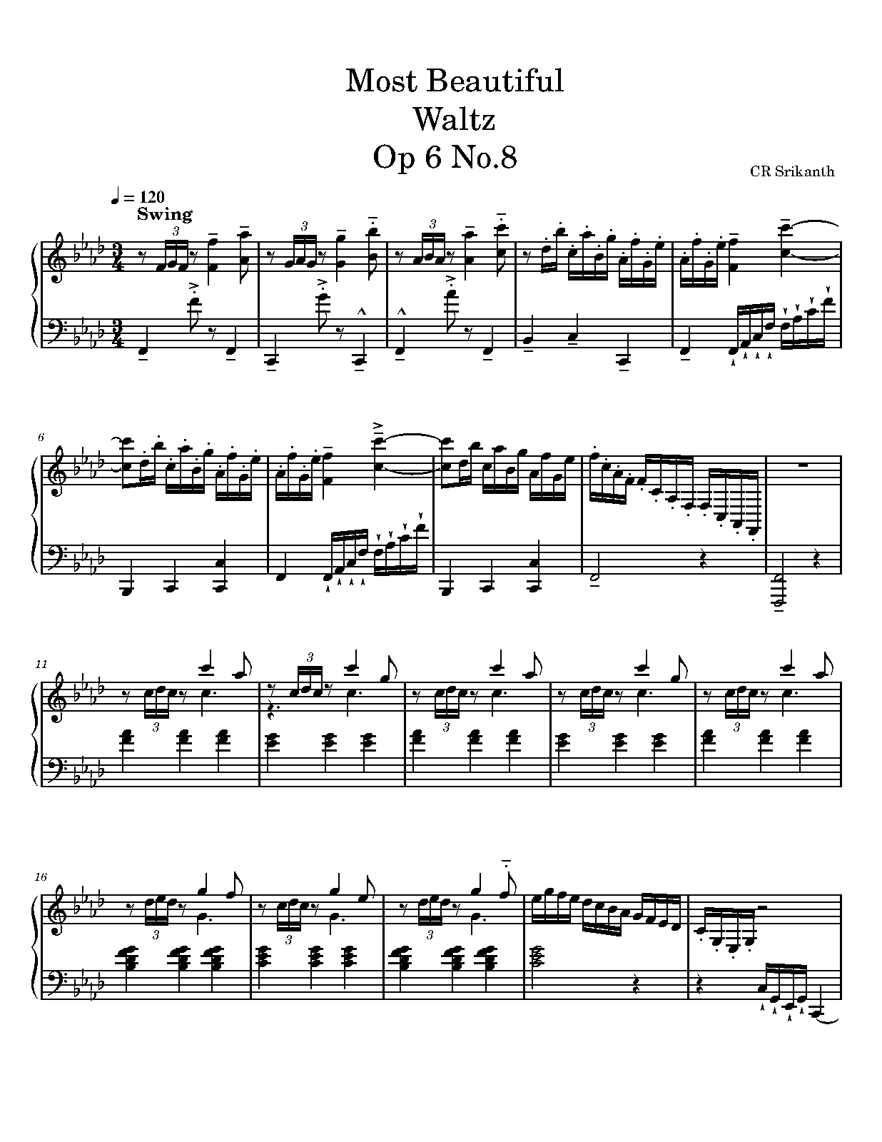 | Extra Information | This is a waltz in triple meter (3/4), titled Most Beautiful from Opus 6, No. 8, composed by Srikanth. The piece follows a traditional waltz structure with flowing left-hand accompaniment and lyrical right-hand melodies. Its tempo marking is given as ♩ = 120, Swing at the opening, suggesting a lively but slightly relaxed interpretation with gentle rhythmic emphasis typical of dance music |