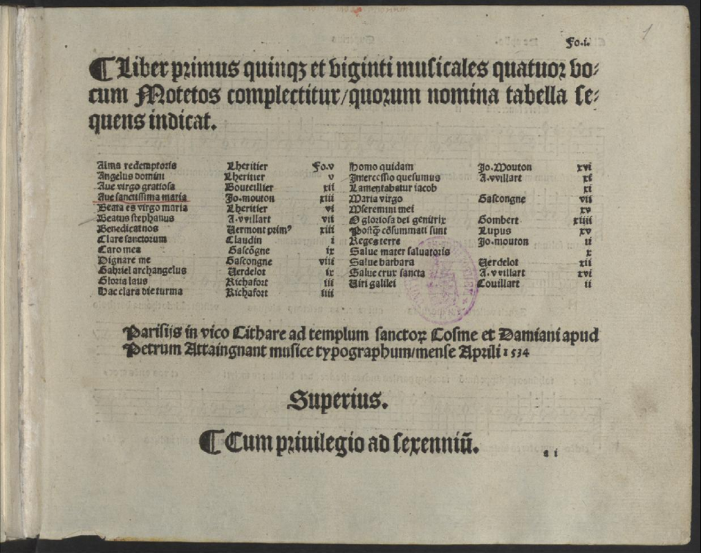 | Alternative. Title | Liber primus quinque et viginti musicales quatuor vocum motetos complectitur |