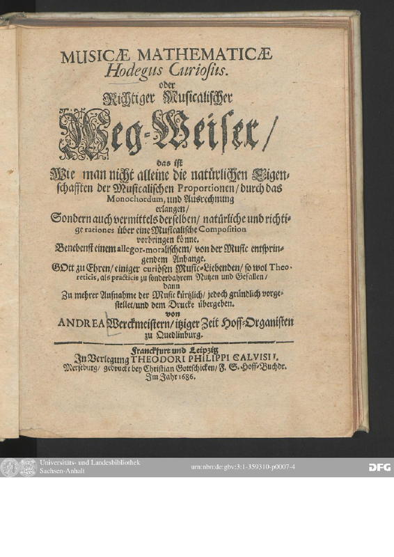 | Alternative. Title | Musicæ Mathematicæ Hodegus Curiosus. oder Richtiger Musicalischer Weg-Weiser, wie man nicht alleine die natuerlichen Eigenschafften der Musicalischen Proportionen, durch das Monochordum, und Ausrechnung erlangen, Sondern auch vermittels derselben, natuerliche und richtige rationes ueber eine Musicalische Composition vorbringen koenne. Benebenst einem allegor-moralischem, von der Music entspringendem Anhange. |