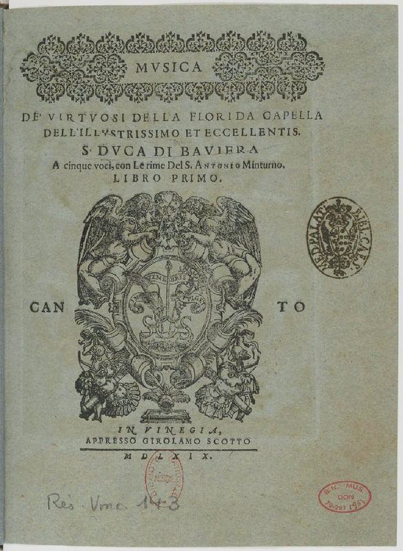 | Alternative. Title | Musica de' virtuosi della florida capella dell'illustrissimo et eccellentis. S. Duca di Baviera a cinque voci, con le rime del S. Antonio Minturno. Libro primo |
