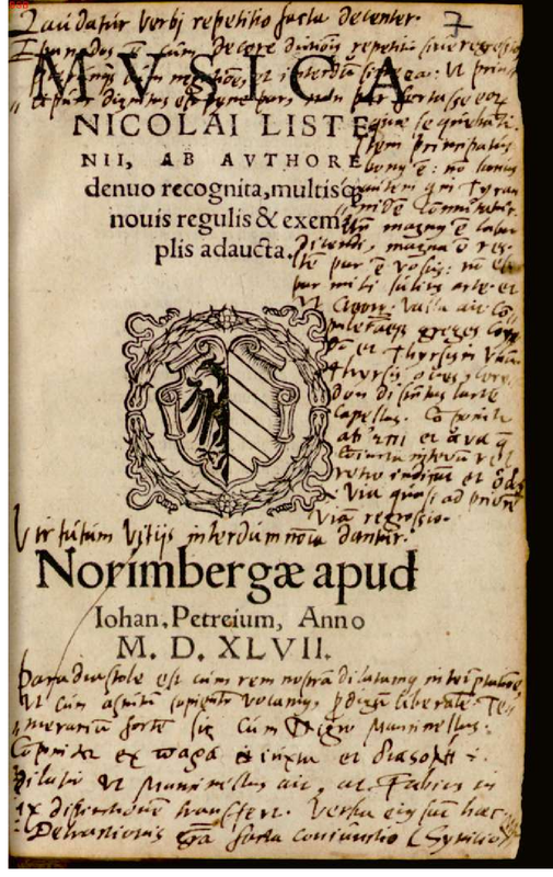 According to Niemölle and Hiller (Nikolaus Listenius, in The New Grove Dictionary of Music and Musicians) this book is a corrected version of Listenius's treatise Rudimenta musicae (first published in 1533), which became very popular as an initial music theory method in Germany and Austria at the time, and it had more than 40 editions between 1537 and 1583.