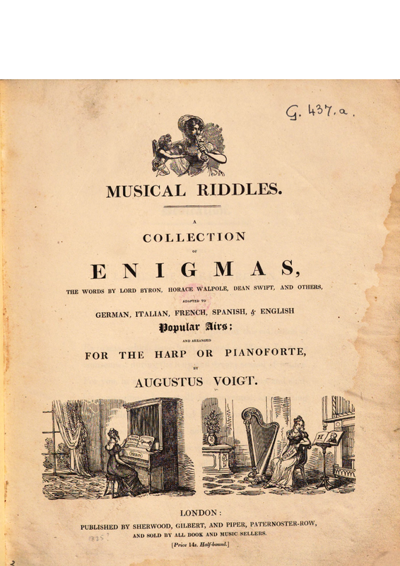 | Alternative. Title | Musical Riddles. A Collection of Enigmas, the words by Lord Byron, Horace Walpole, Dean Swift, and others, adapted to German, Italian, French, Spanish, & English Popular Airs; and arranged for the harp or pianoforte |