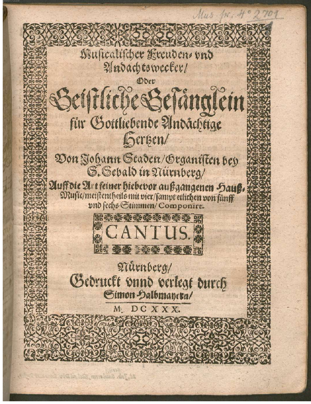 | Alternative. Title | Musicalischer Freuden- vnd Andachtswecker, oder Geistliche Gesaenglein fuer Gottliebende Andaechtige Hertzen von Johann Staden ... auff die Art seiner hiebevor aussgangenen Hauss-Music, meistentheils mit vier, sampt etlichen von fuenff und sechs Stimmen, componirt. |