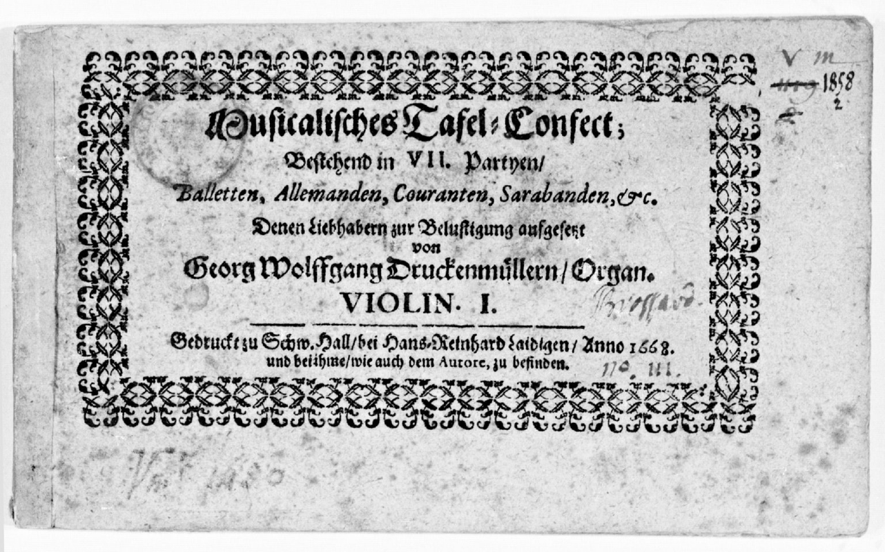 - Musicalisches Tafel-Confect; bestehend in VII. Partyen, Balletten, Allemanden, Couranten, Sarabanden, &c. denen Liebhabern zur Belustigung aufgesetzt von Georg Wolfgang Druckenmüllern, Organ.</span>