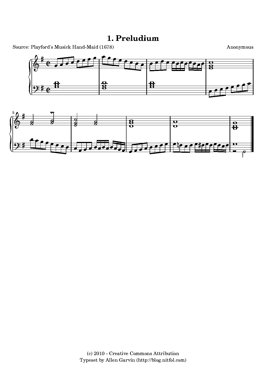 ⇒ 12 more: 2. The Canaries or the Hay (anon.) • 3. An Ayre (anon.) • 4. Corant (anon.) • 5. Saraband (anon.) • 6. A Jegg, (Ben Sandley) • 7. An Ayre (anon.) • 9. Saraband, (William Lawes, 1602-1645) • 10. Selengers Round (anon.) • 11. Scotish March (anon.) • 12. Freemans Delight (anon.) • 27. The Kings Delight (anon.) • Engraving files (Lilypond)