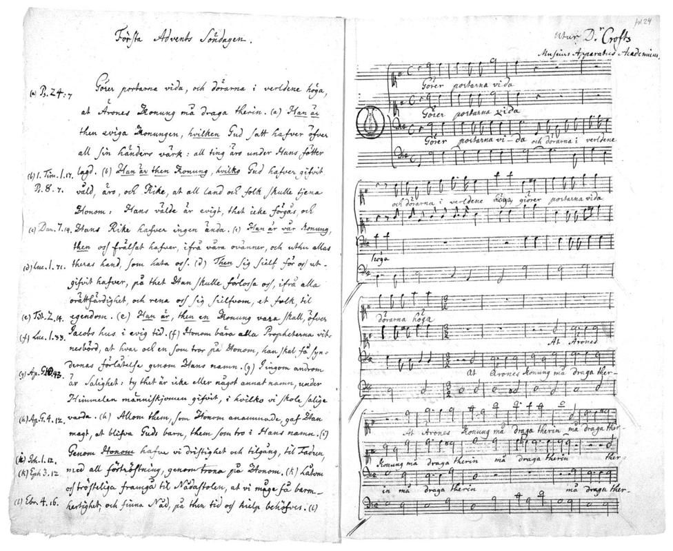 Appears to be an arrangement of different movements, possibly from both of Croft's Odes, set to Swedish text for the 1st Sunday in Advent.