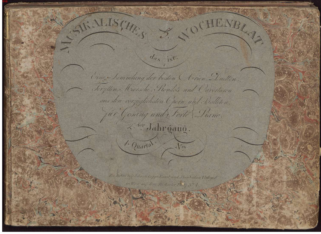 Musikalisches Wochenblat [sic] das ist: Eine Sammlung der besten Arien, Duetten, Terzetten, Maersche, Rondo's und Ouverturen aus den vorzüglichsten Opern und Balletten, für Gesang und Forte Piano