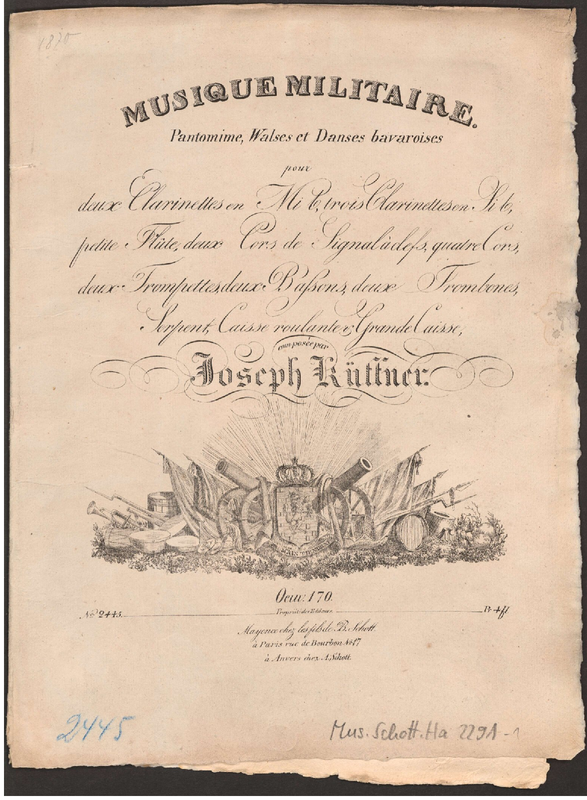 | Alternative. Title | Pantomine,Walses et Danses bavaroise pour deux Clarinettes en Mi b, trois Clarinettes en Si b, petite Flûte, deux Cors de signal a clefs, quatre Cors, deux trompettes, deux bassons, deux trombones, serpent, caisse roulante et grande caisse |