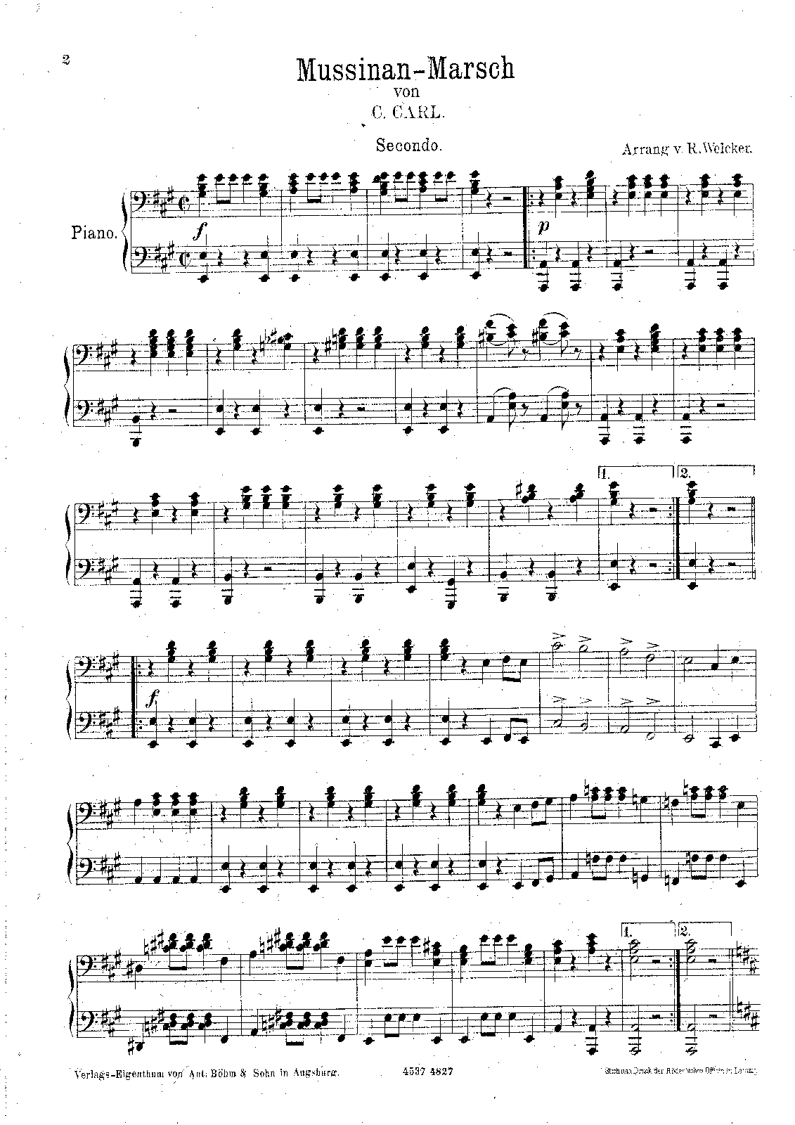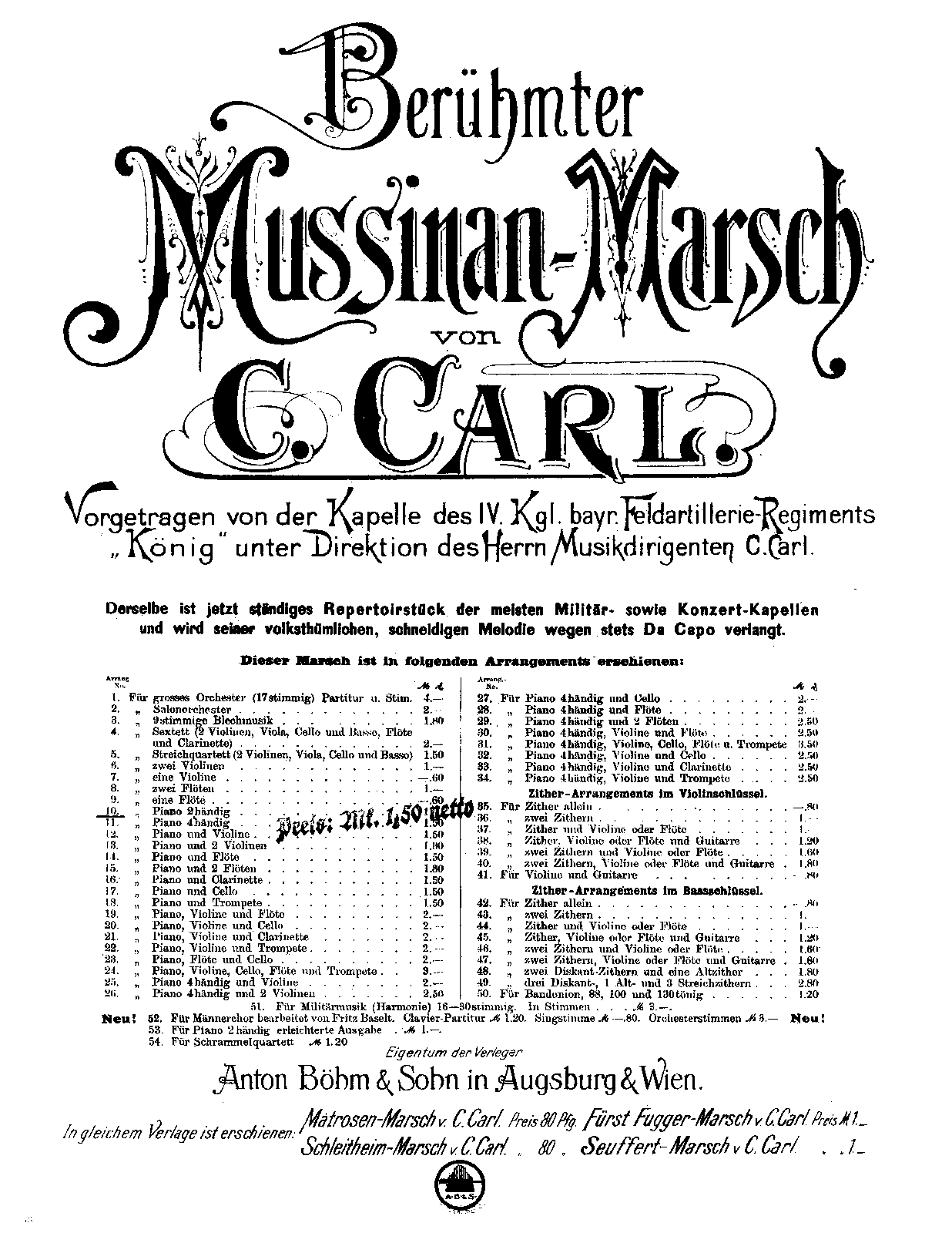 | Extra Information | Written 1882 for the retirement of Oberst Ludwig Ritter von Mussinan - Kommandeur des Kgl. Bayer. IV. Feldartillerie-Regiments "König" in Augsburg. Carl Carl was the conductor of the military band of this regiment. Therefore written for a military band, but Hofmeister lists the first publication in 1884 for piano. |