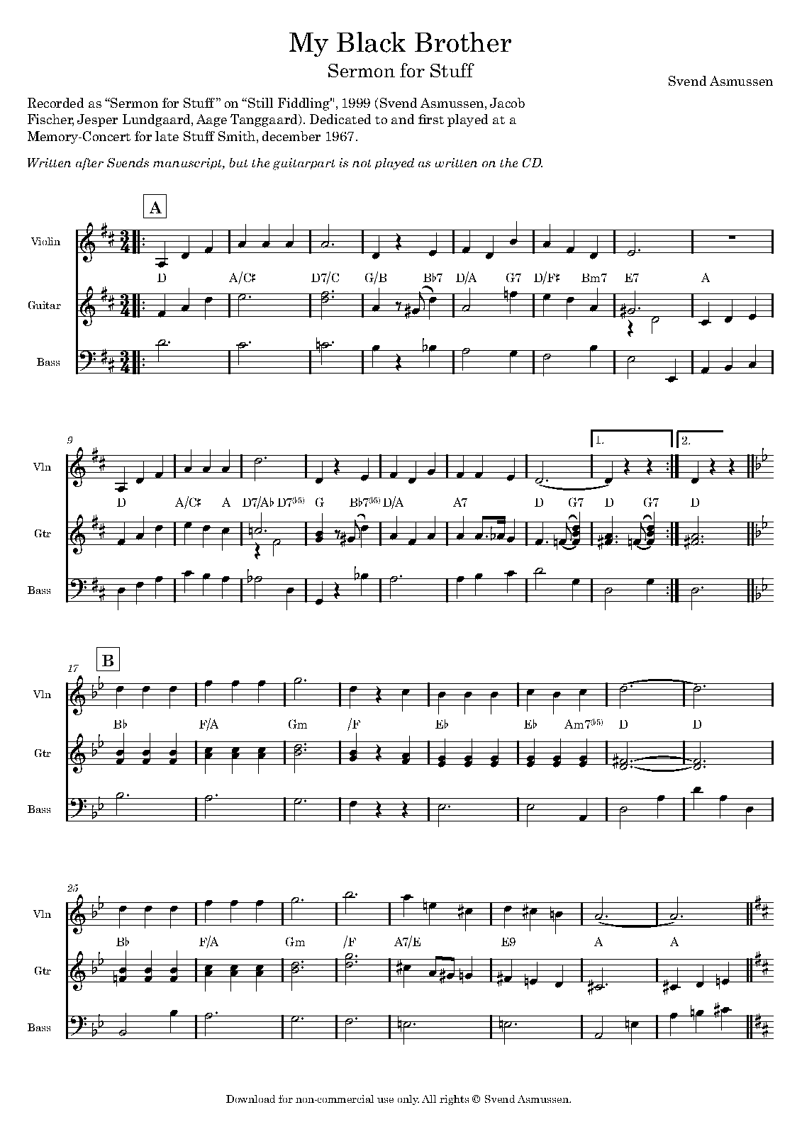 | Extra Information | Stuff Smith's swinging and rhythmic intense playing was a great inspiration for the young Svend Asmussen. Recorded as "Sermon for Stuff" on "Still Fiddling", 1999 (Svend Asmussen, Jacob Fischer, Jesper Lundgaard, Aage Tanggaard). Dedicated to and first played at a Memory-Concert for late Stuff Smith, december 1967. The score is printed after Svends manuscript, but the guitarpart is not played as written on the CD. |