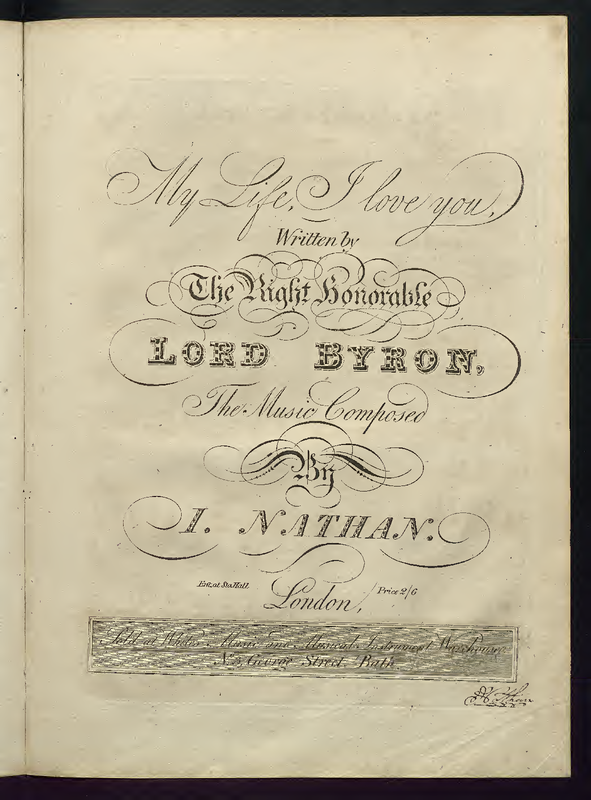In submitting this Music to the candid decision of the Public, it may be proper to observe that every stanza of the Song which, is selected from the Poems subjoined to Lord Byron's "Childe Harold's Pilgrimage," concludes with the words a Romaic expression of tenderness, for which I have taken the liberty of substituting his Lordship's translation "My Life, I love you." In the third stanza, the vow "By all the token flowers &c." means those flowers which a lover sends to his mistress as a mark of his affection; for, as ladies in the East are not taught to write, lest they should scribble assignations, the sentiments of the parties are conveyed by flowers, cinders, pebbles &c. which have different significations. A bunch of flowers tied with hair, implies "Take me and fly."