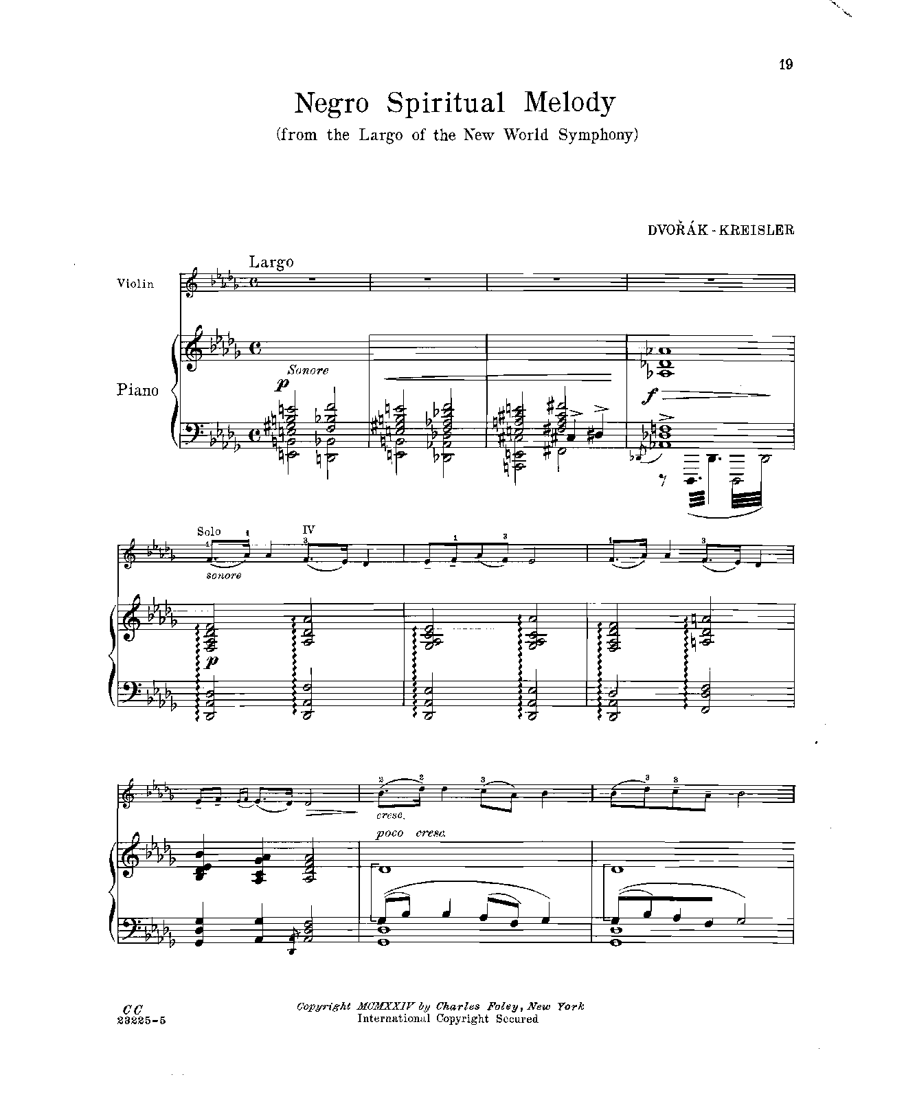 | Extra Information | Abridged arrangement of the Largo (No.2) from Symphony No.9, Op.95 by Dvořák. Kreisler's arrangement is only 5 bars less than the famous setting for voice and piano published 2 years earlier, Goin' Home by William Arms Fisher. Probably re-titled to avoid any potential IP issues. The opening section from the 2nd movement of Dvořák's symphony is 45 bars (of the complete 127 bars). |