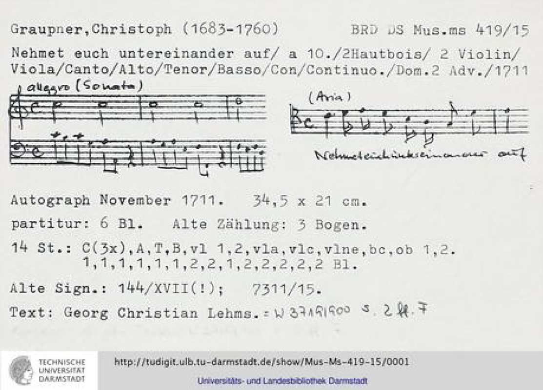 | Instrumentation | SATB, 2 oboes, strings, continuo |