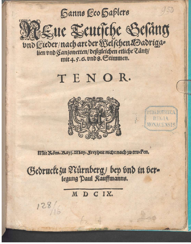 | Extra Information | The title should be translated as "New German songs in the manner of Italian madrigals and canzonettas". The adjective "welsch" can mean "foreign" in general but during the 16th century came to refer specifically to romance-language foreigners, particularly Italians (see the entry in the Grimms' Deutsches Wörterbuch for "wälsch"). This can be put in context with the fact that Hassler was one of the first German composers who went to study in Italy. |