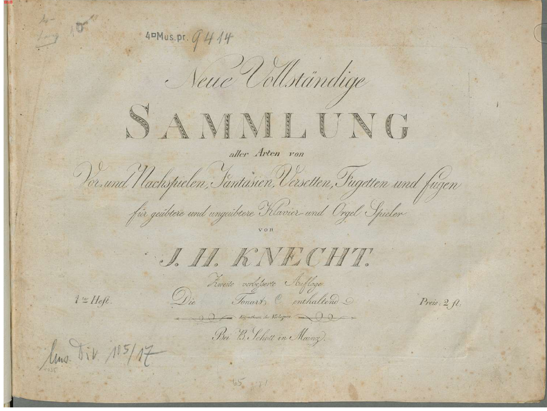 | Alternative. Title | Neue Vollständige Sammlung aller Arten von Vor- und Nachspielen, Fantasien, Versetten, Fugetten und Fugen für geübtere und ungeübtere Klavier und Orgel Spieler |