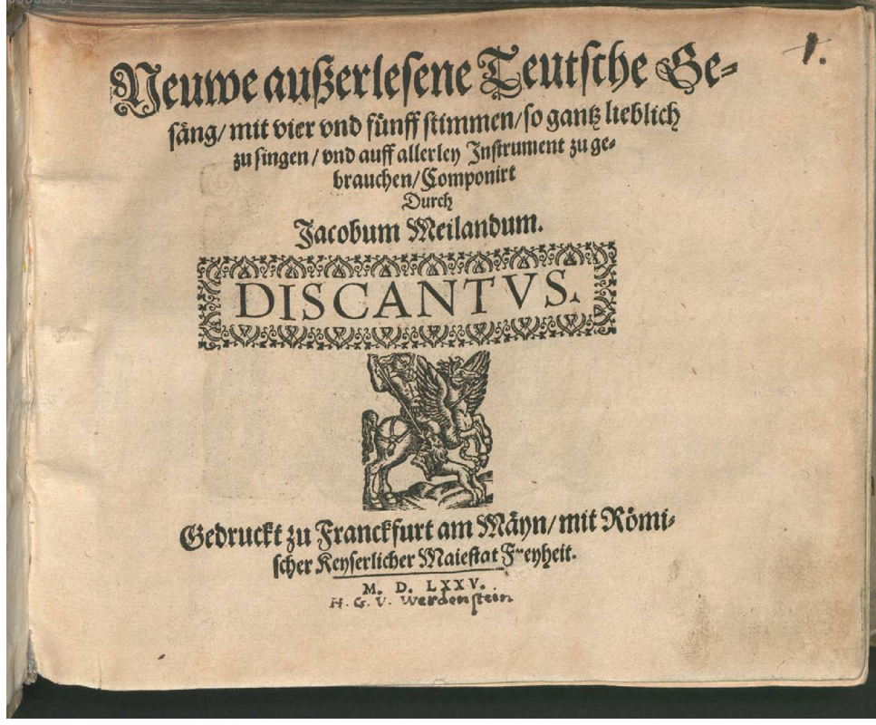 | Alternative. Title | Neuwe außerlesene Teutsche Gesäng, mit vier und fünff stimmen, so gantz lieblich zu singen, und auff allerley Instrument zu gebrauchen, Componirt durch Jacobum Meilandum |